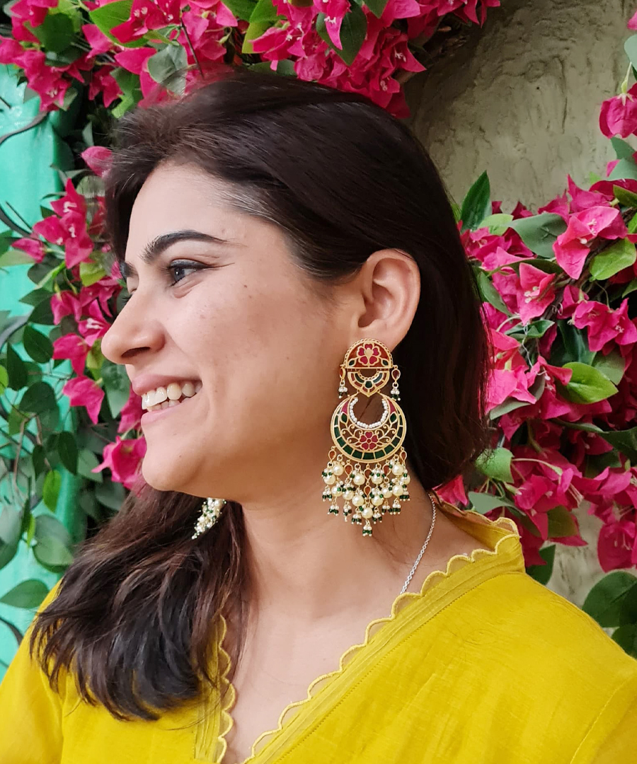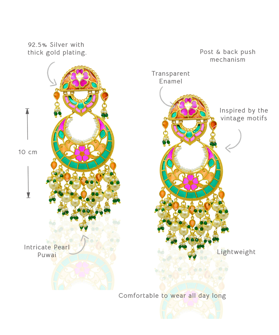 More than just jewelry, these Chandbali earrings are a memory to wear. Handcrafted from 925 sterling silver with a luxurious gold plating, they feature intricate enamel work in soft pink, green & orange.