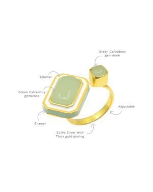 This comfortable adjustable ring is handcrafted in 92.5% silver studded with green calcedony gemstone and impeccable enamelling, it has thick gold plating. These comfortable adjustable rings can be worn by pairing two colors to add charm and make it a conversation piece. , Plating: Gold Plated, Metal Type: 92.5% Sterling Silver, Enamel / plating / gemstone: Natural gemstone Green Calcedony, Lock Mechanism: Adjustable Ring, Measurement cm : Rec . 1.8cm x 1.3cm
