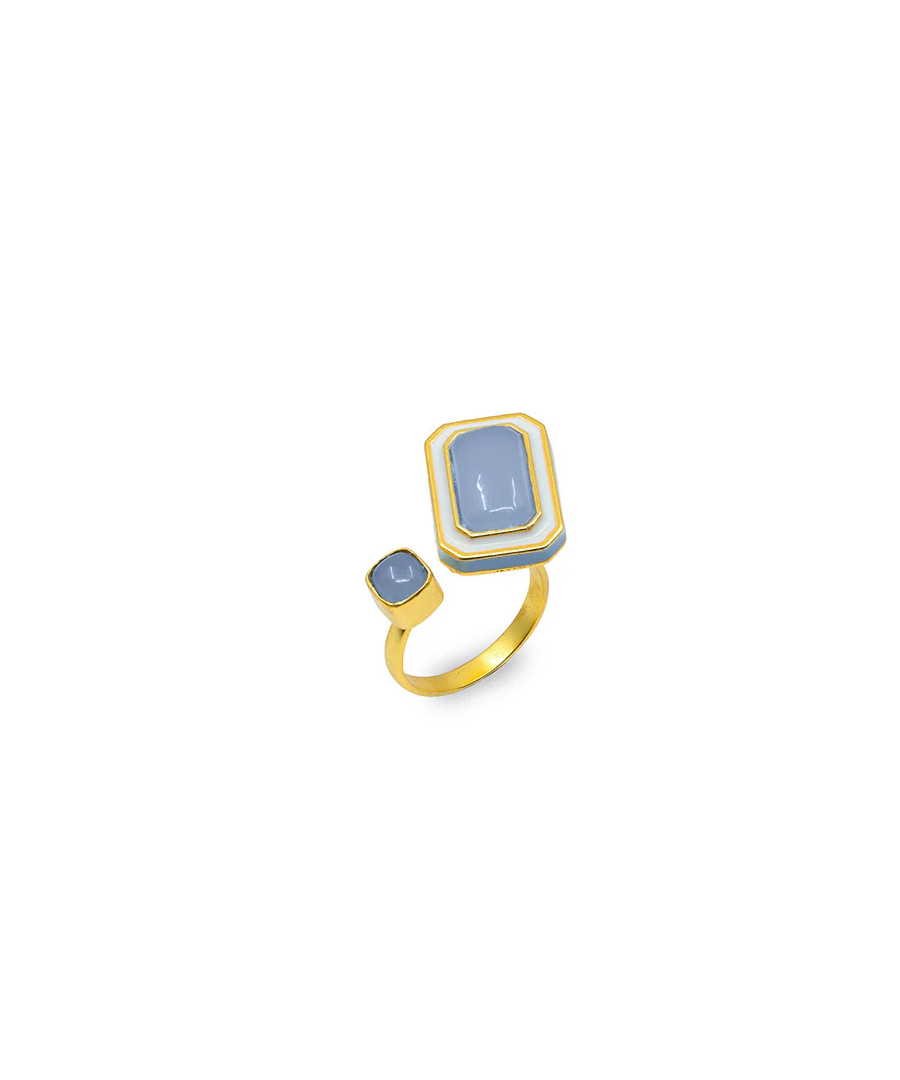 This comfortable adjustable ring is handcrafted in 92.5% silver studded with blue calcedony gemstone and impeccable enamelling, it has thick gold plating. These comfortable adjustable rings can be worn by pairing two colors to add charm and make it a conversation piece. , Plating: Gold Plated, Metal Type: 92.5% Sterling Silver, Enamel / plating / gemstone: Natural gemstone Blue Calcedony, Lock Mechanism: Adjustable Ring, Measurement cm : Rec . 1.8cm x 1.3cm