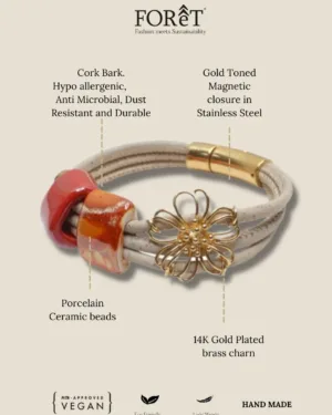 Handcrafted in luxurious white cork and bejewelled in ceramic beads and Gold plated flower charm, the 'Flower & Light' Cork Bracelet is an Ode To our mother - Gaia.