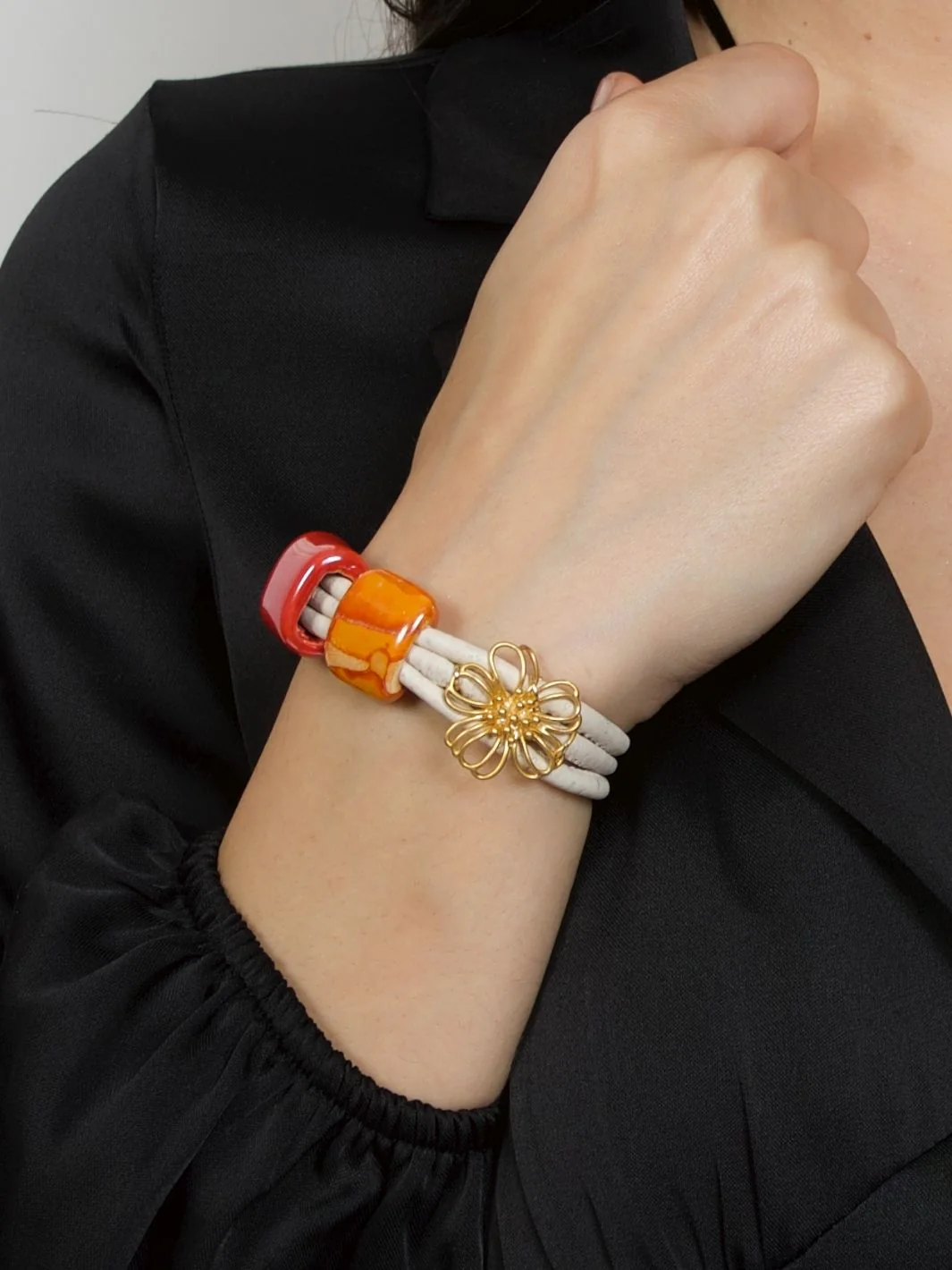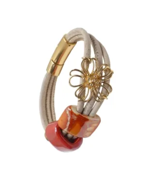 Handcrafted in luxurious white cork and bejewelled in ceramic beads and Gold plated flower charm, the ‘Flower & Light’
