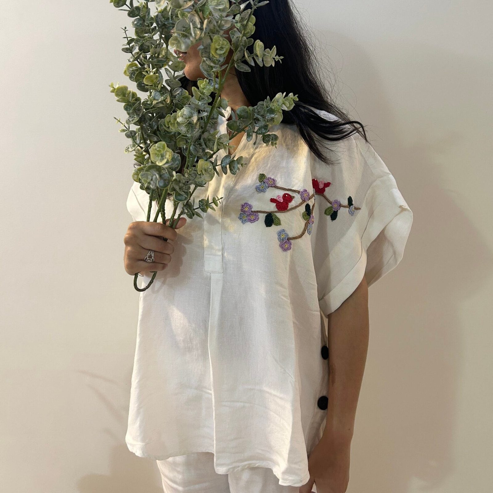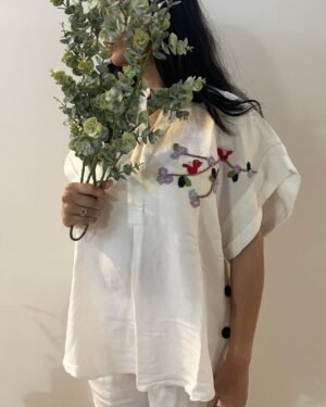 Discover effortless sophistication with the Freesize White Serene Stitch Linen Shirt. Crafted from premium linen, this oversized shirt features a V-neck and a front placket, adorned with delicate crochet details of flowers, leaves, and a bird. Its free-size fit offers relaxed comfort and versatile styling options. Available in one-size option.