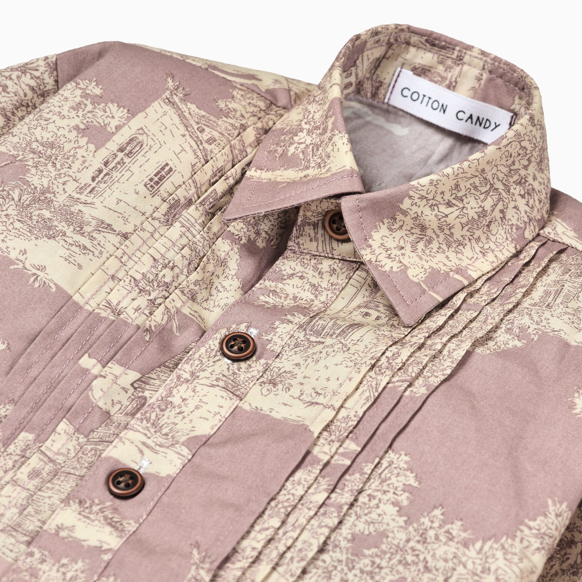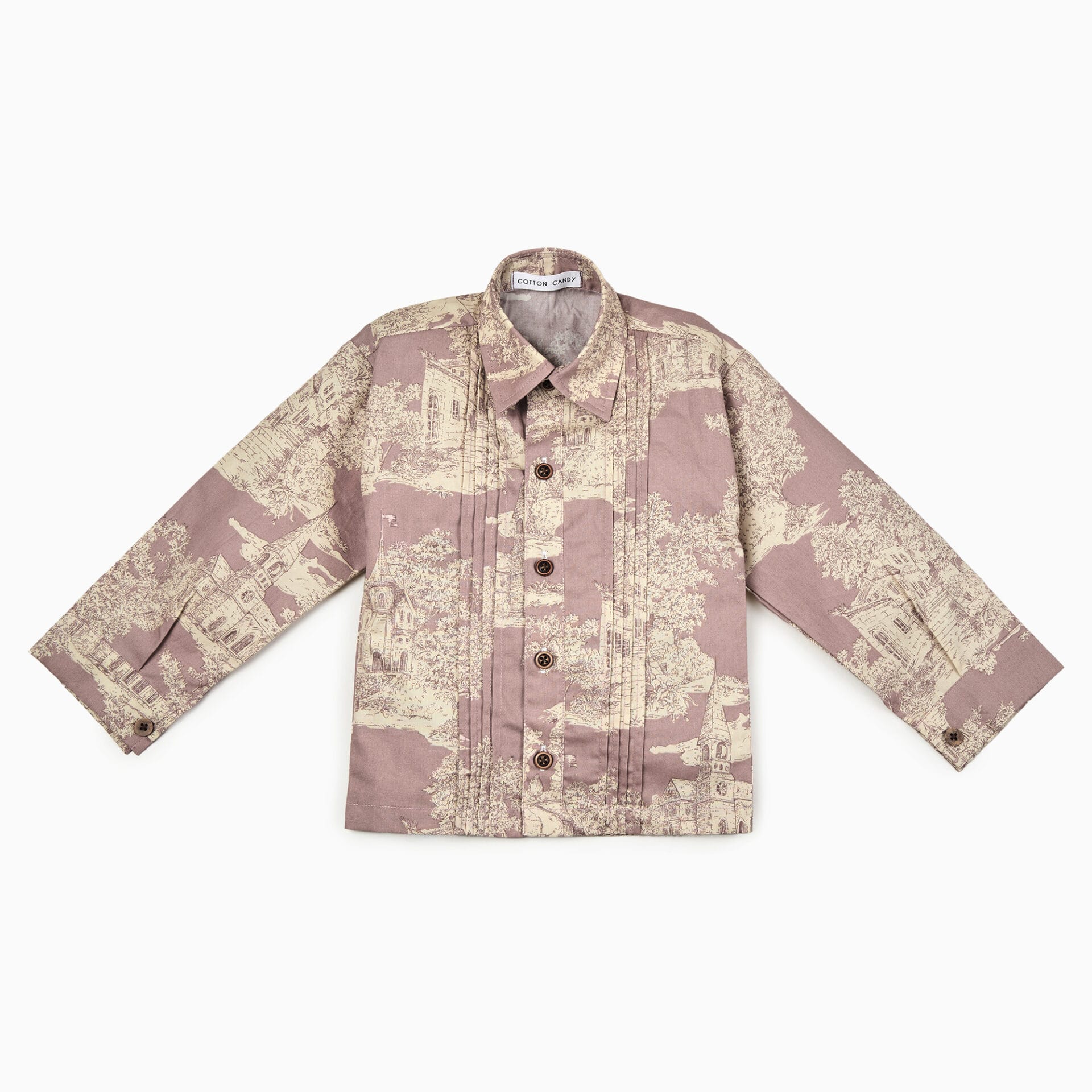 The French Castle Vintage Toile Pintuck Shirt is crafted from breathable cotton poplin for a light and comfortable feel. Featuring a classic collar neckline, full sleeves, and a button-up closure, it offers a timeless silhouette. The printed pattern paired with pintuck detailing adds a vintage-inspired charm, making it an ideal choice for casual wear. Easy to care for, this shirt is suitable for gentle machine washing.