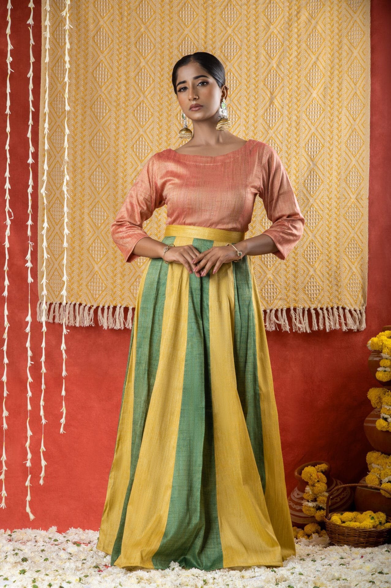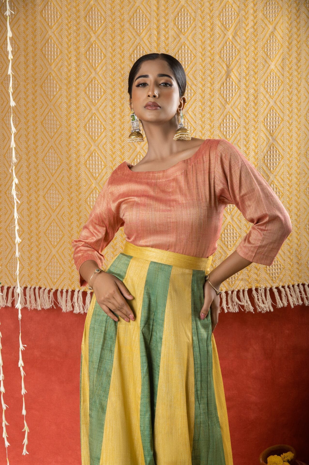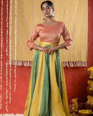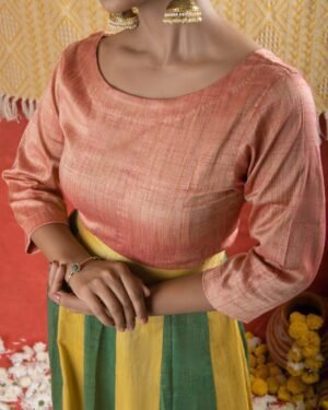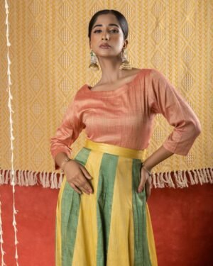 Featuring structured panels a boat neck and three quarter sleeves this gajri Matka cotton top exudes sophisticated style. WASH INSTRUCTIONS - ONLY DRYCLEAN. Transparency & Certificate: Made in India with care, using natural dyes and produced in small batches with ISO certification. Shipping Courier charges DOMESTIC(IN INDIA) : ?500/KG, INTERNATIONAL : ?3000/KG