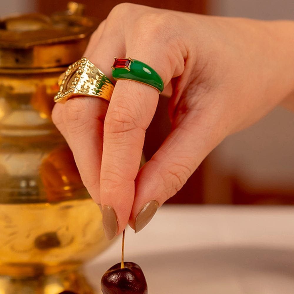 Experience the enchantment of the Garnet Forest Ring, where vibrant green enameling envelops your finger like a lush, ve