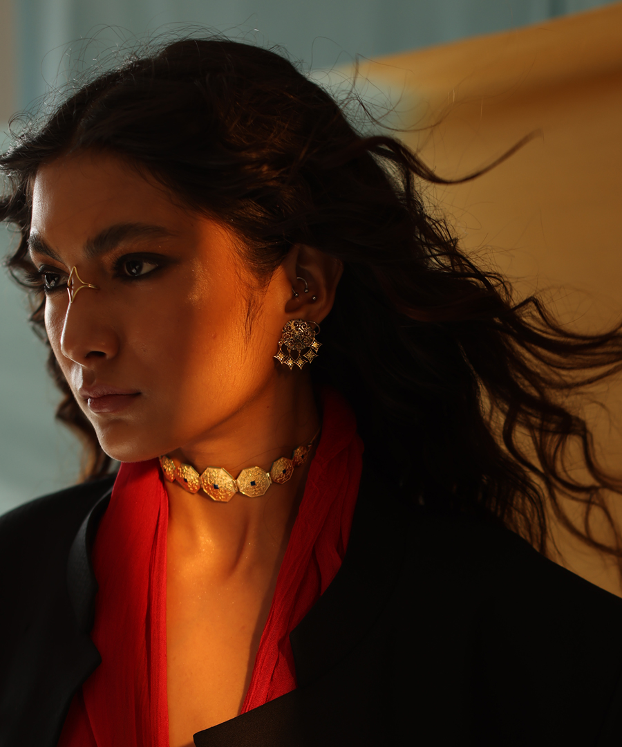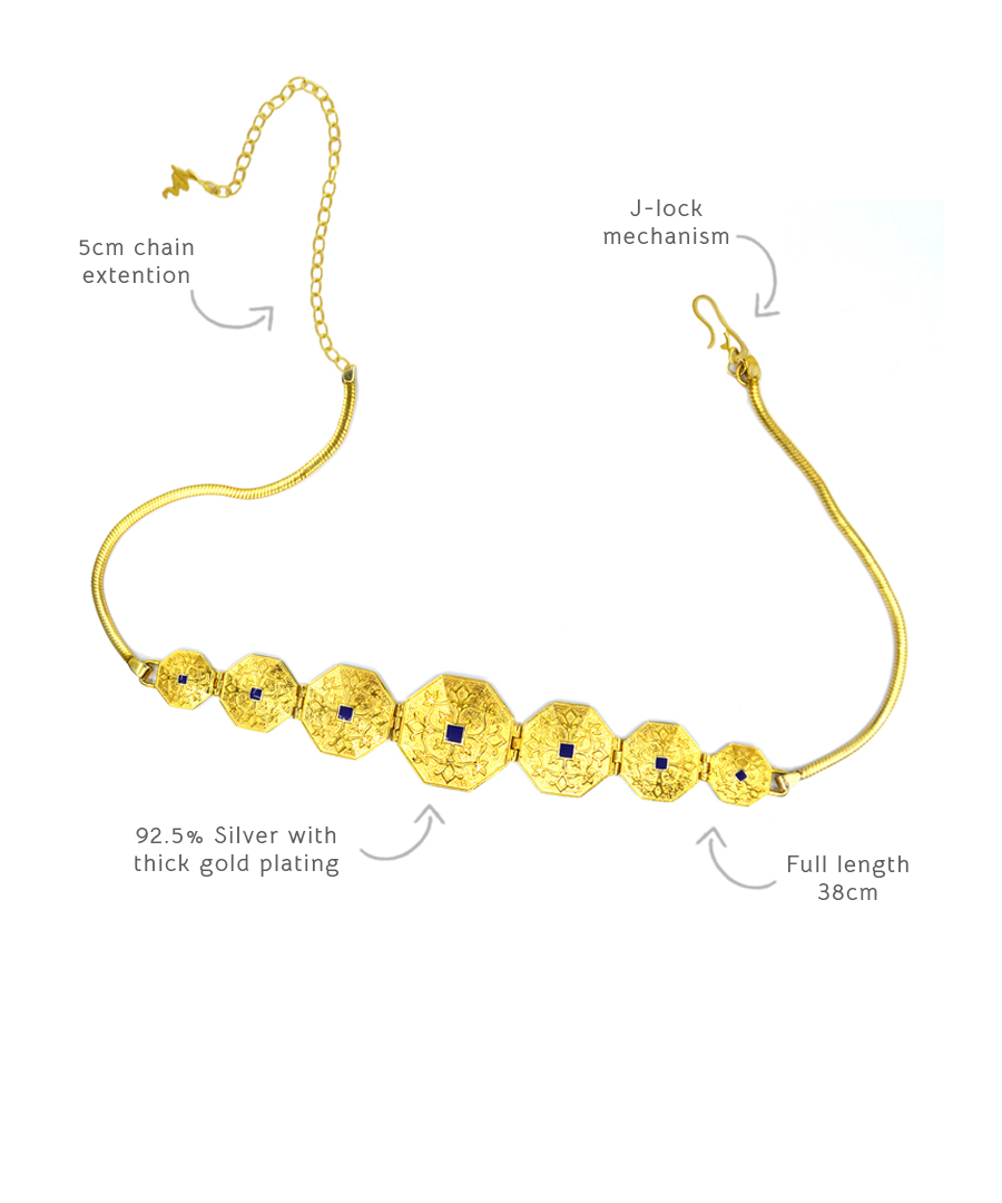 The Gaur kanthi choker is exudes charm and strength in equal measures. The graduating size of the central motif looks very gracefiul on the neck. This choker is handcrafted in 92.5% silver, with thick gold plating, the chain at back has a fish hook clasp and adjustable rings for a perfect fit., Plating: Gold Plated, Metal Type: 92.5% Sterling Silver, Enamel / plating / gemstone: Gold oxidised, Lock Mechanism: J-Lock , Measurement cm : Full length 40 cm, Measurement inches: Full length 15.50 inch, Care Instruction: Keep away from water, perfume and other liquids. Do not use any cleaning agents. Clean when storing in the provided pouches. Store them in moisture free areas and keep them away from water and liquid fragrances.