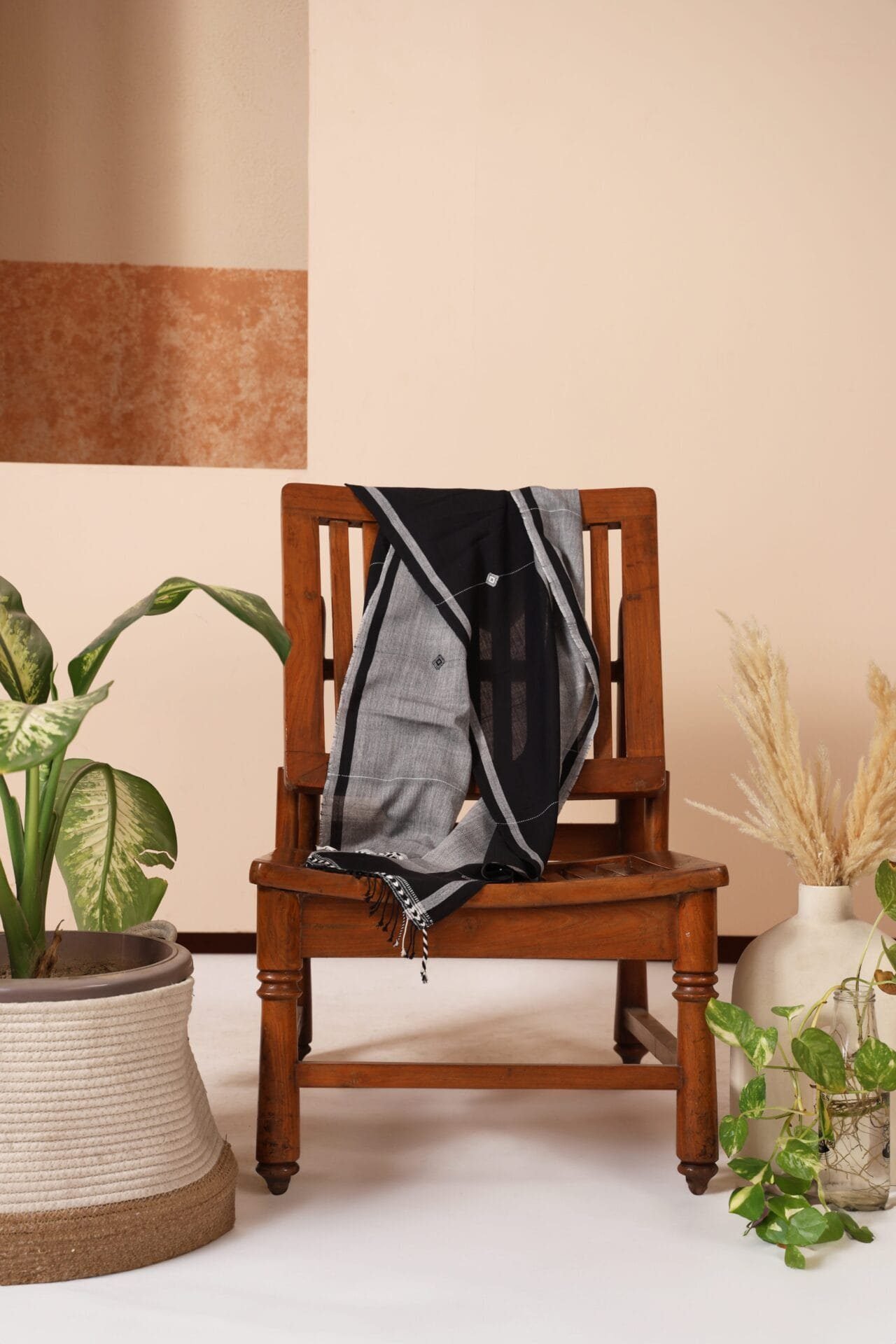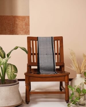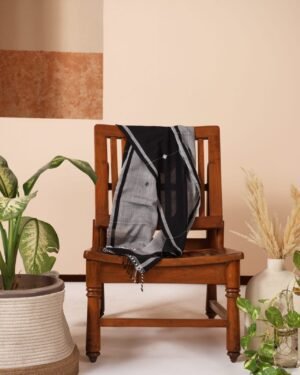 Elevate your style with a handloomed stole adorned with captivating geometric motifs gracefully blending shades of black and grey. WASH INSTRUCTIONS - ONLY DRYCLEAN. Transparency & Certificate: Made in India with care, using natural dyes and produced in small batches with ISO certification. Shipping Courier charges DOMESTIC(IN INDIA) : ?500/KG, INTERNATIONAL : ?3000/KG