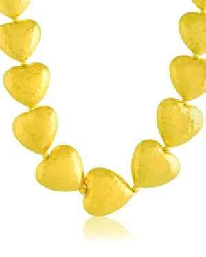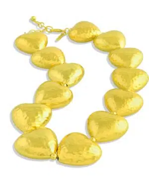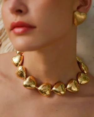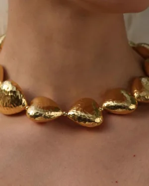 Add a touch of romance and modern elegance to your jewelry collection with the Gilded Concave Graduating Hearts Necklace, designed to reflect warmth, love, and contemporary luxury.Featuring graduating concave heart motifs, this necklace is finished with 22KT real gold plating over a premium brass alloy base, giving it a rich glow and smooth reflective surface. The sculpted heart design creates a striking yet graceful statement that flatters both ethnic and western outfits.Perfect for party wear, festive celebrations, romantic evenings, weddings, and special occasions, this necklace pairs beautifully with dresses, sarees, gowns, and Indo-western ensembles.✨ Key Highlights:Graduating concave heart design with radiant finish22KT real gold plating for premium shineDurable, skin-friendly brass alloyLightweight yet statement-making silhouetteLong-lasting brilliance with proper careAn ideal choice for women who love romantic statement jewelry with a refined, modern touch.