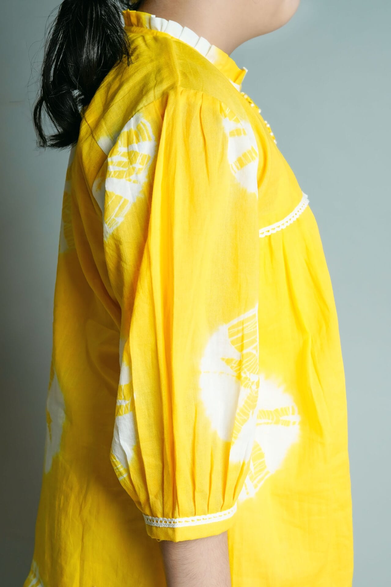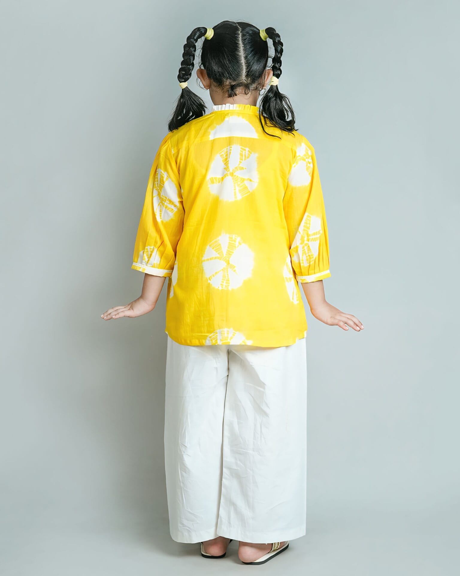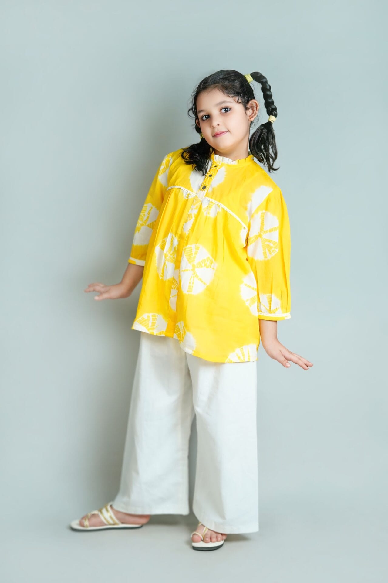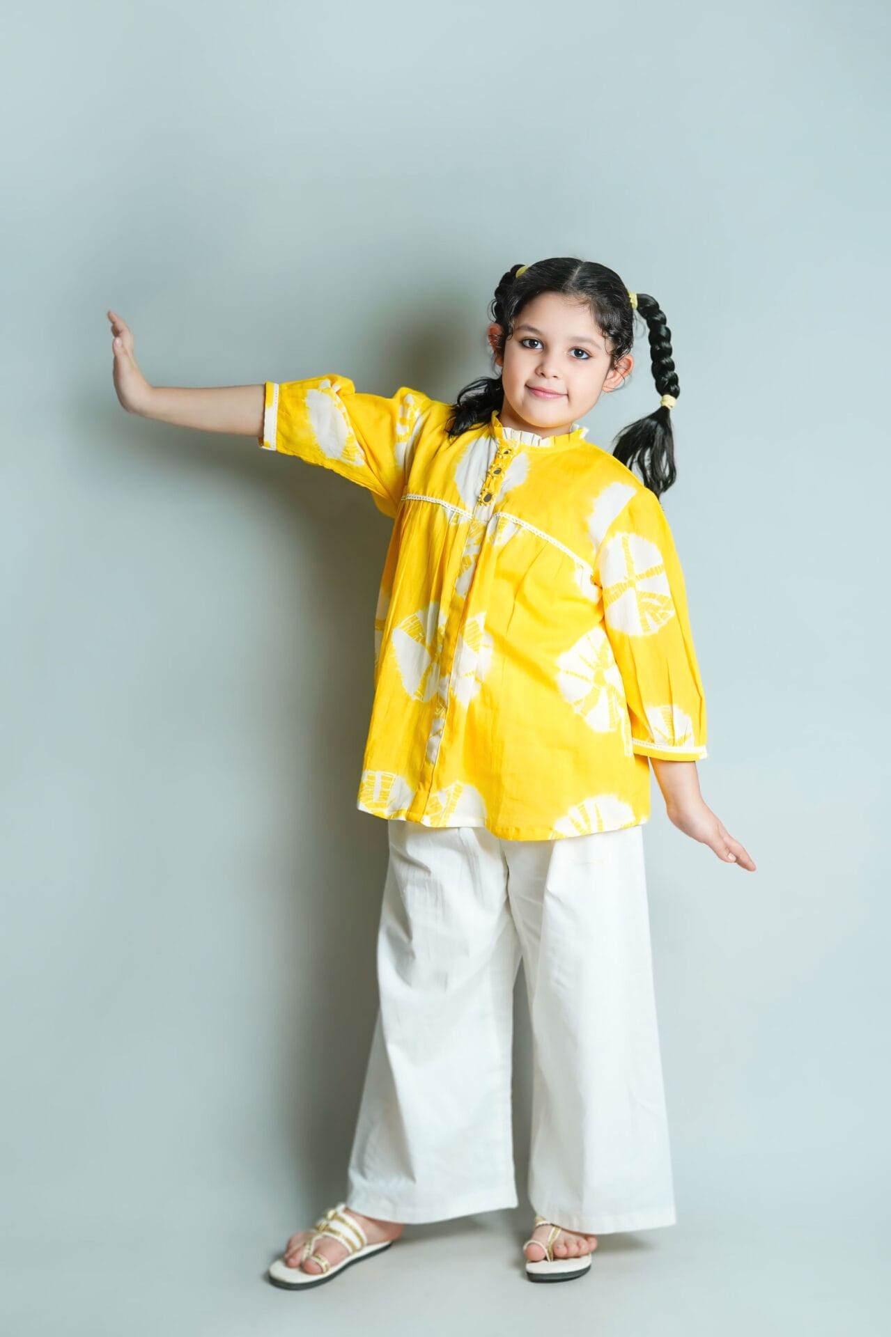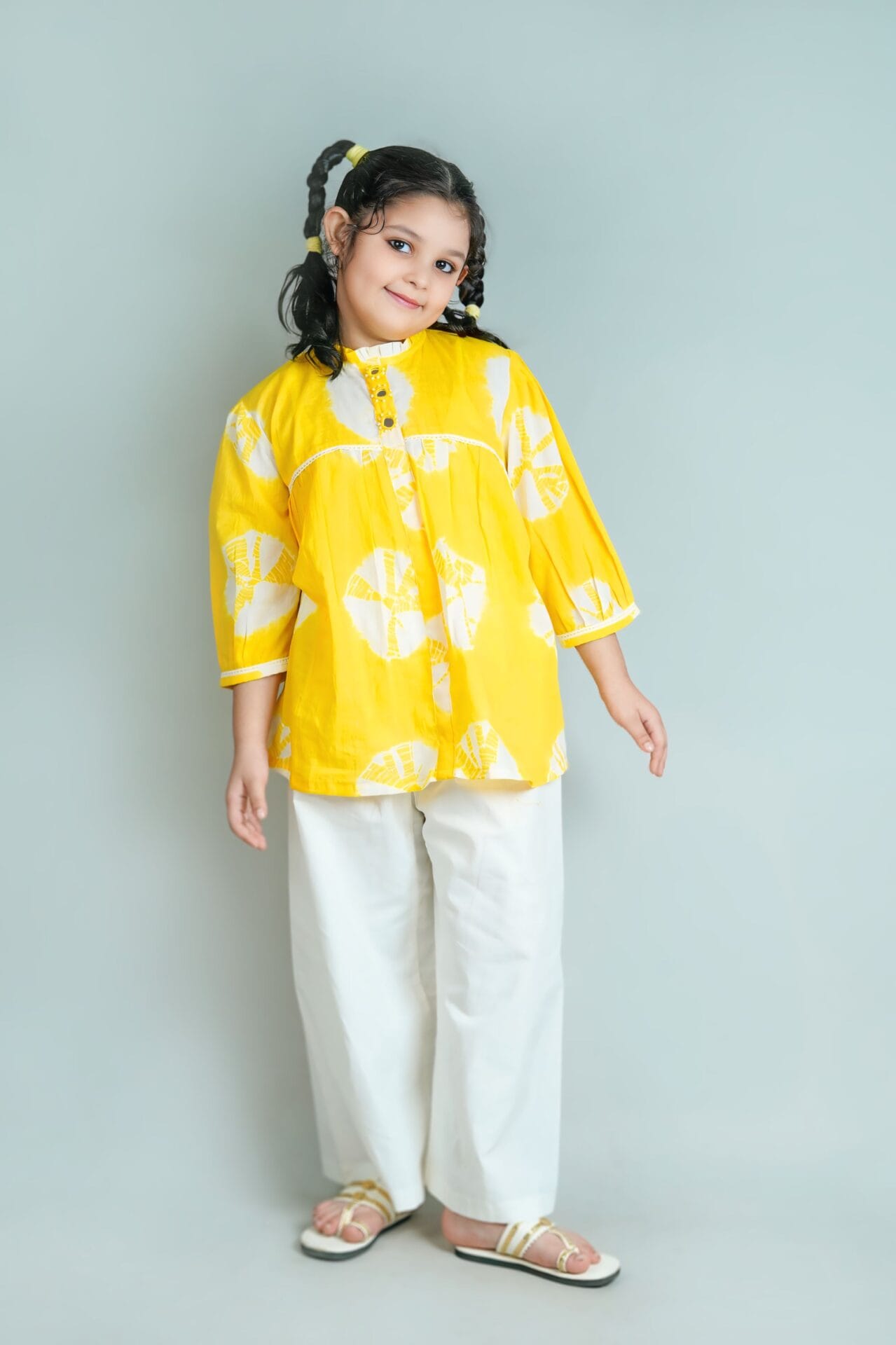 Bright and breezy, this Girls Yellow Bloom Tie-Dye Co-ord Set features a soft cotton top with playful tie-dye patterns paired with comfortable white pants. Perfect for everyday wear, outings, and festive fun — stylish, lightweight, and super comfy for all-day play!