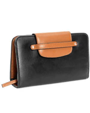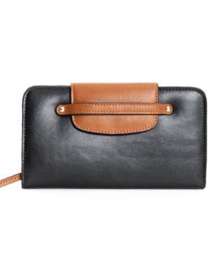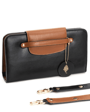 Crafted from a stylish blend of black and gingerbread apple leather, the Cybele Wallet is designed to seamlessly integrate into your daily routine. The eye-catching ornamentation adorning the detachable shoulder strap elevates the wallet's look, making it a must-have accessory that complements any outfit.
