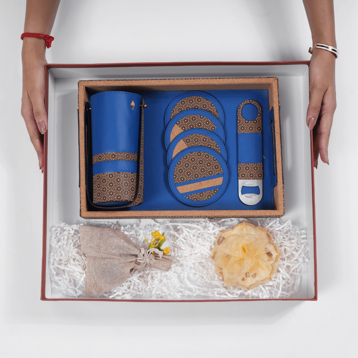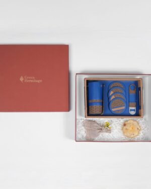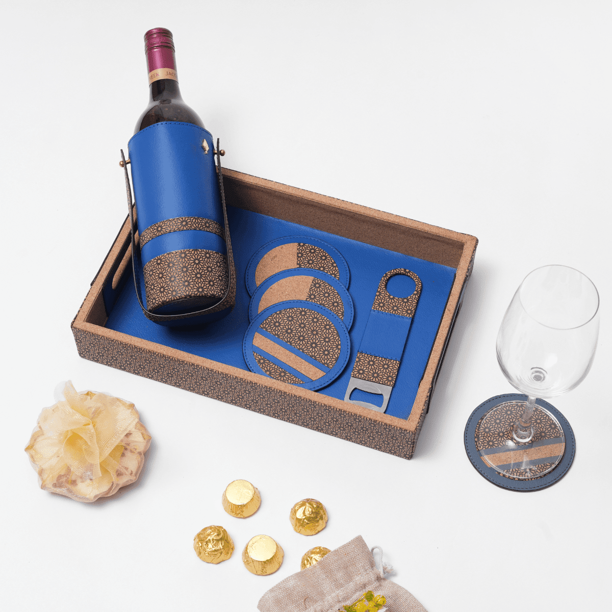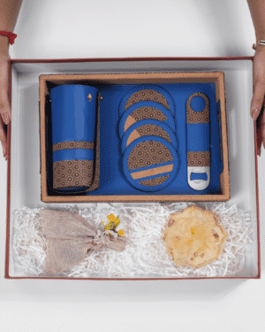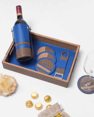 Luxury sustainable bar set crafted from plant leather and recycled wood, perfect for elegant eco-conscious gifting.