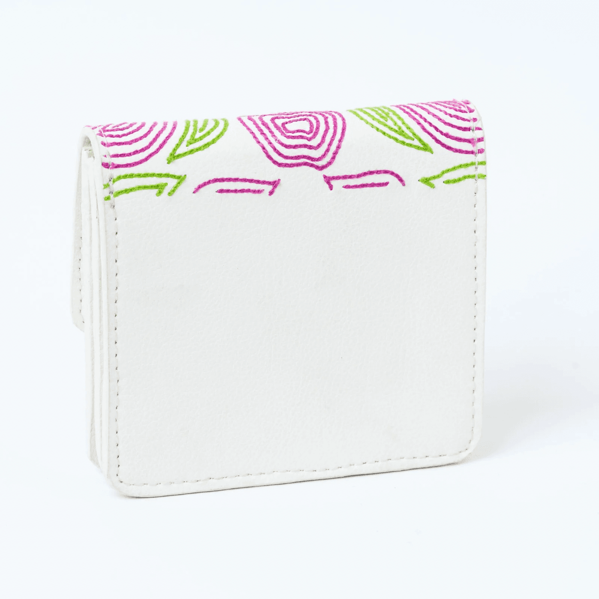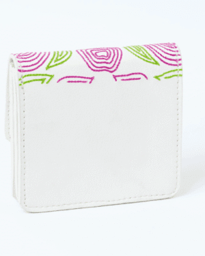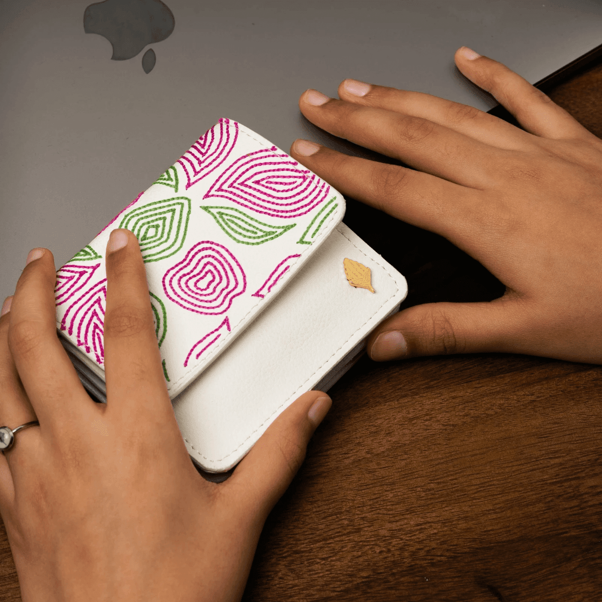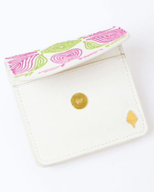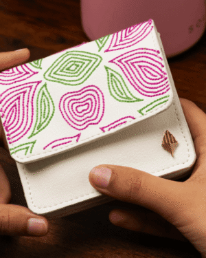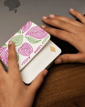 Hand-embroidered expandable cardholder crafted from plant-based leather, combining artisanal beauty with everyday functi