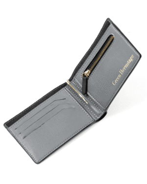 The Black & Grey Zeus Bi-Fold Wallet, crafted from premium cactus leather, is a sophisticated accessory designed for everyday use. Its sleek design and contrasting color combination exude a touch of luxury, making it the perfect complement to any outfit.