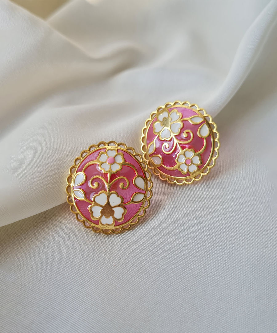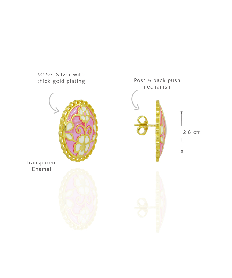 Delicate yet bold, these Gulaabi Keerat stud earrings are handcrafted in 925 sterling silver with thick gold plating and intricate enamel work. The soft pink base is adorned with ivory and gold floral motifs. The scalloped gold border adds a charming vintage finish, making them the perfect blend of heritage elegance and everyday sophistication., Plating: Gold Plated, Metal Type: 92.5% Sterling Silver, Enamel / plating / gemstone: Transparent Enamel, Lock Mechanism: Post and push back, Measurement cm : 2.8 cm , Measurement inches: 1.10 inch , Care Instruction: Keep away from water, perfume and other liquids. Do not use any cleaning agents. Clean when storing in the provided pouches. Store them in moisture free areas and keep them away from water and liquid fragrances.