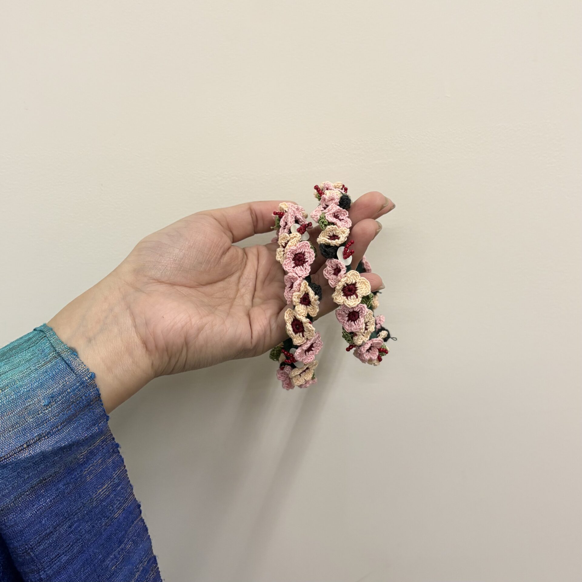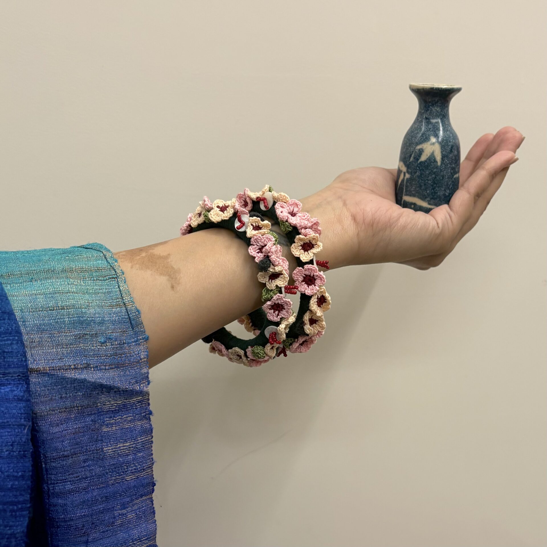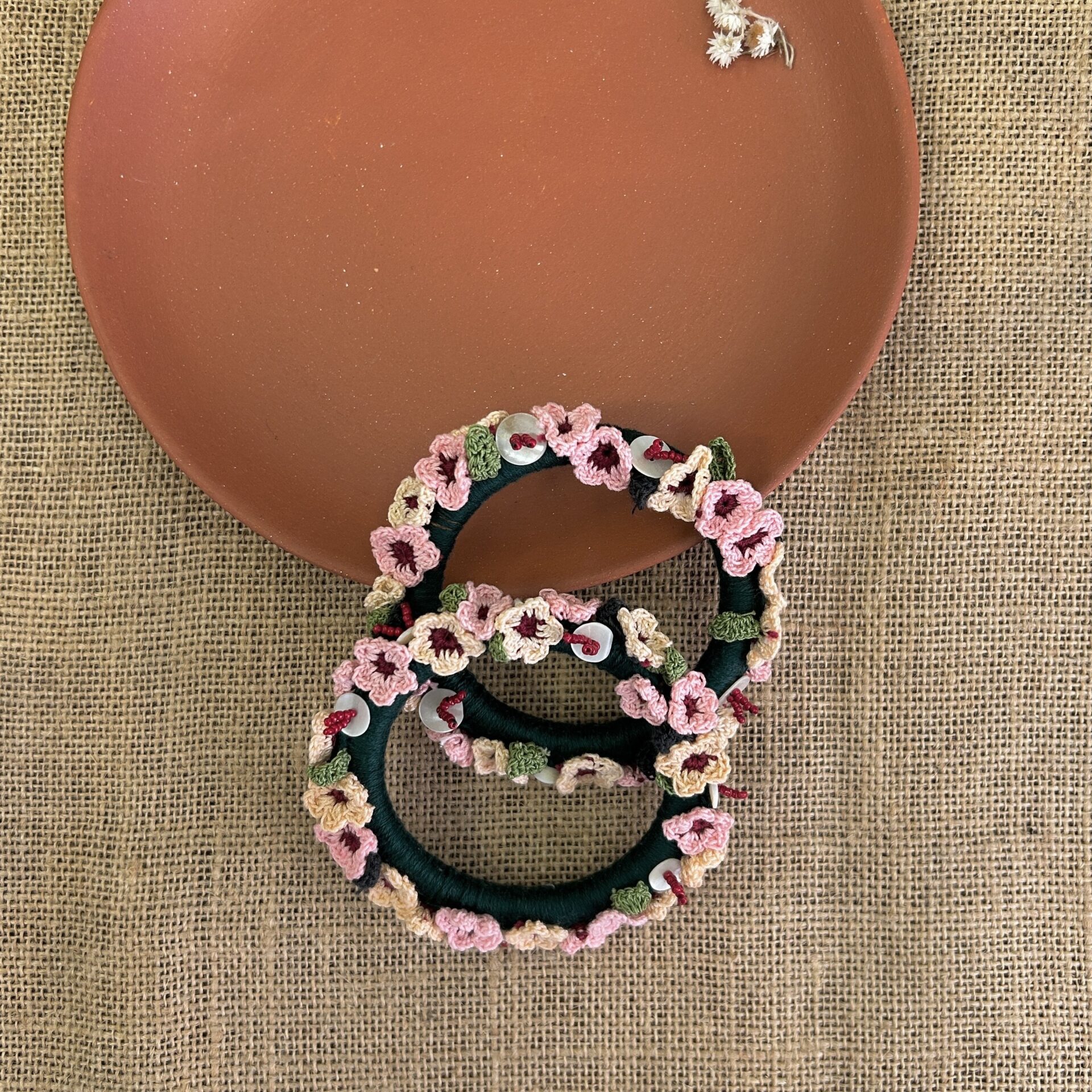 Soft, playful, and delicately handcrafted ? these pink daisy bangles bring a gentle bloom to your everyday look. Made on rosewood bases, each bangle features hand-crocheted daisies paired with tiny crochet leaves, maroon seed beads, and shell buttons that add a touch of earthy charm and texture.