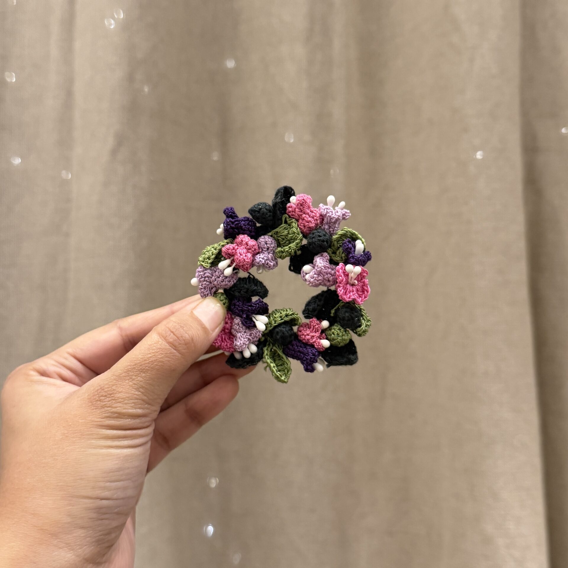 Deep purple tulips take form in this delicately handcrafted brooch, brought together with fine crochet work and soft contrast at the centre. Each tulip is detailed with white filament accents at the centre, creating a gentle highlight against the rich purple petals. Paired with subtle crochet leaves, all elements are carefully stitched onto a metal ring base and finished with a metal pin at the back for secure, easy wear.