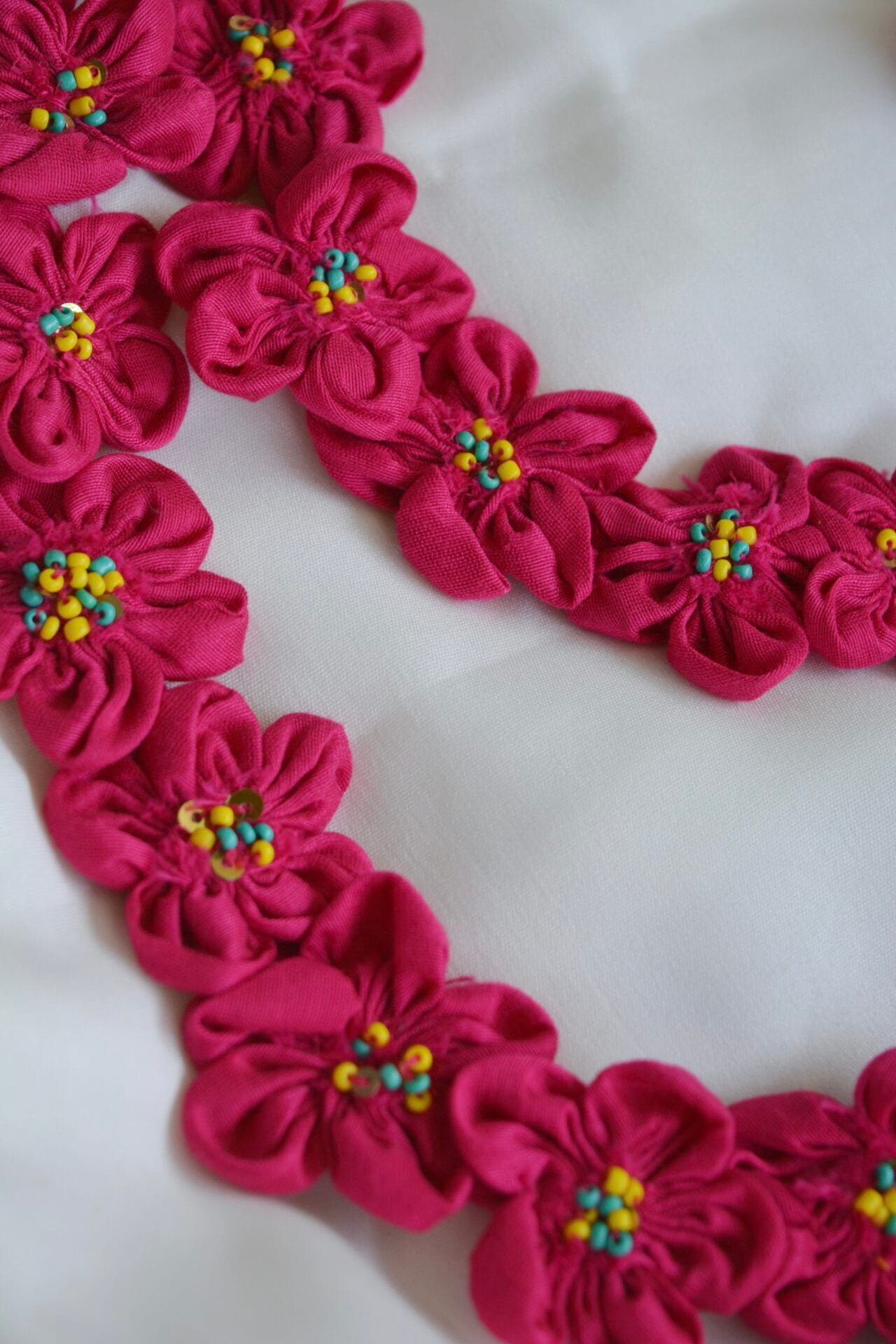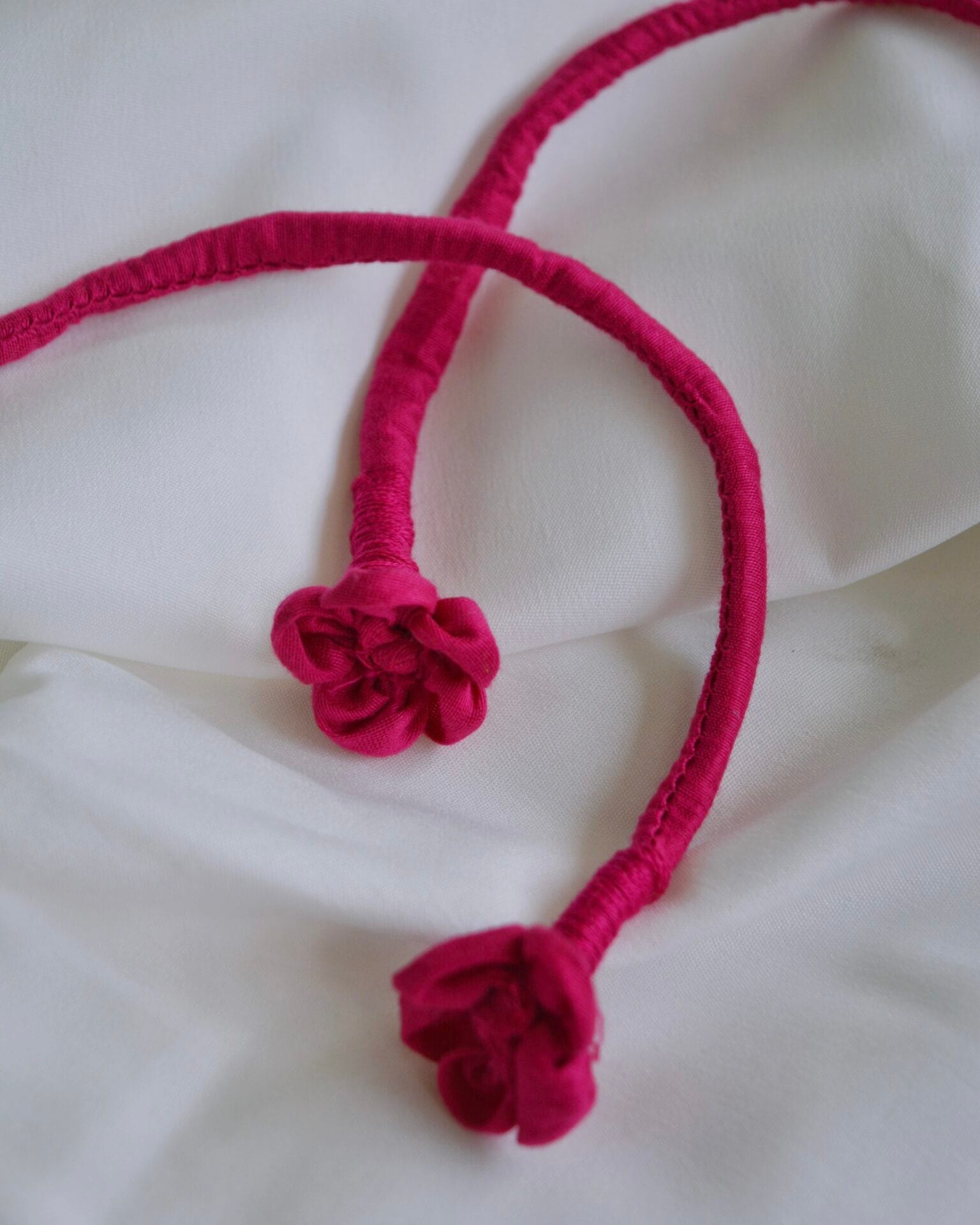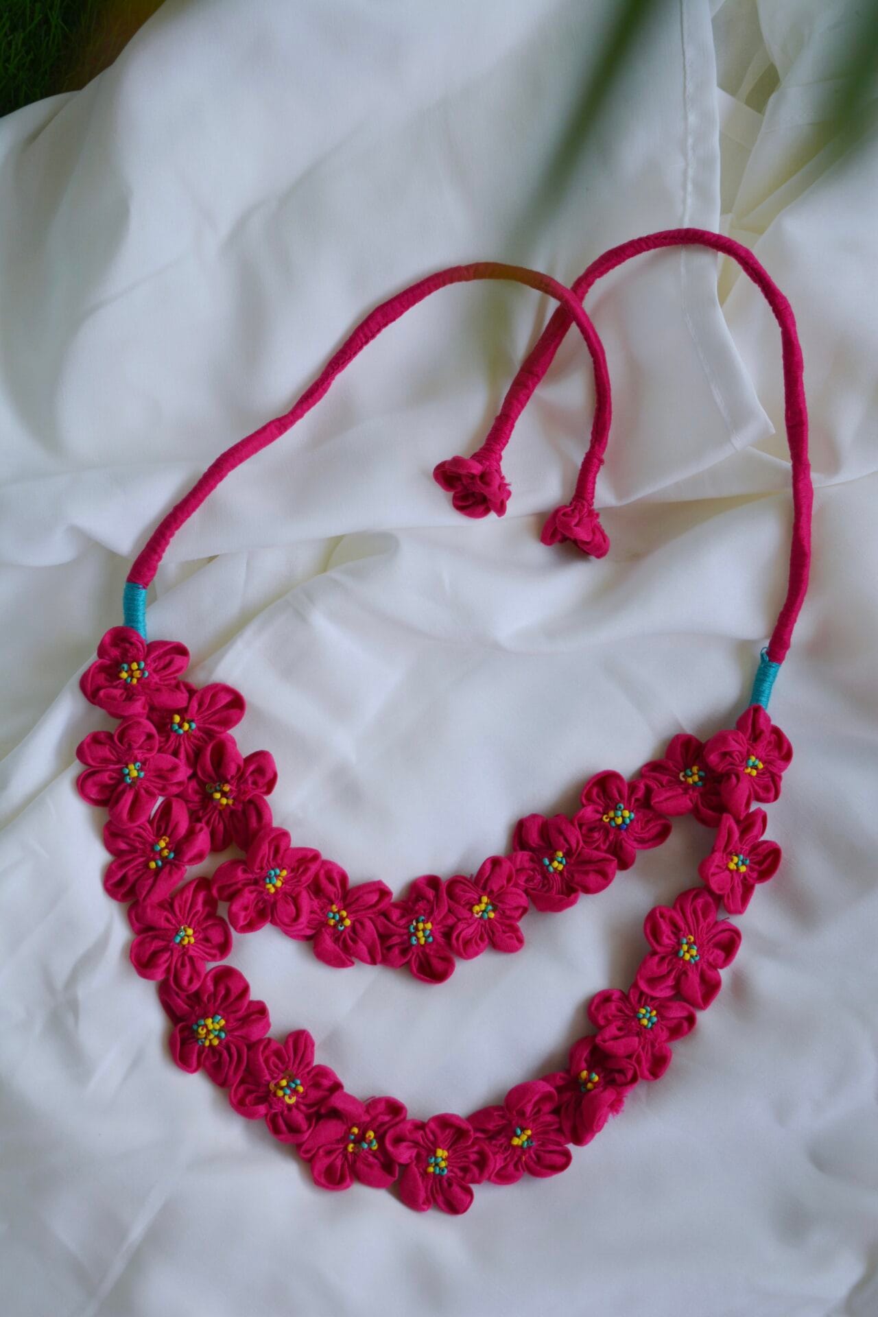 Introducing the Hairat neckpiece, a meticulously handcrafted jewel that seamlessly marries elegance with artistry. This exquisite neckpiece is composed of over two dozen delicate flowers, each crafted from the finest pink silk, exuding a soft luster that captures the essence of timeless beauty. The flowers are thoughtfully arranged, creating a stunning visual symphony that is both captivating and unique.