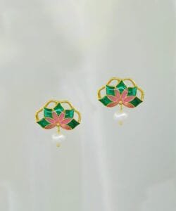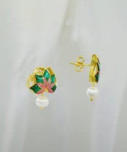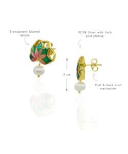 These Gul half earrings are handcrafted in 92.5% sterling silver, with thick gold plating. These earrings has a transparent enamel details in vibrant colors with flower motif design and hanging pearl. These earrings has post and push back mechanism for easy wear., Plating: Gold Plated, Metal Type: 92.5% Sterling Silver, Enamel / plating / gemstone: Transparent Enamel, Lock Mechanism: Post and push back, Measurement cm : Length - 3 cm / width - 2.5 cm OR , Measurement inches: Length - 1.18 inch / width - 0.98 inch, Care Instruction: Keep away from water, perfume and other liquids. Do not use any cleaning agents. Clean when storing in the provided pouches. Store them in moisture free areas and keep them away from water and liquid fragrances.