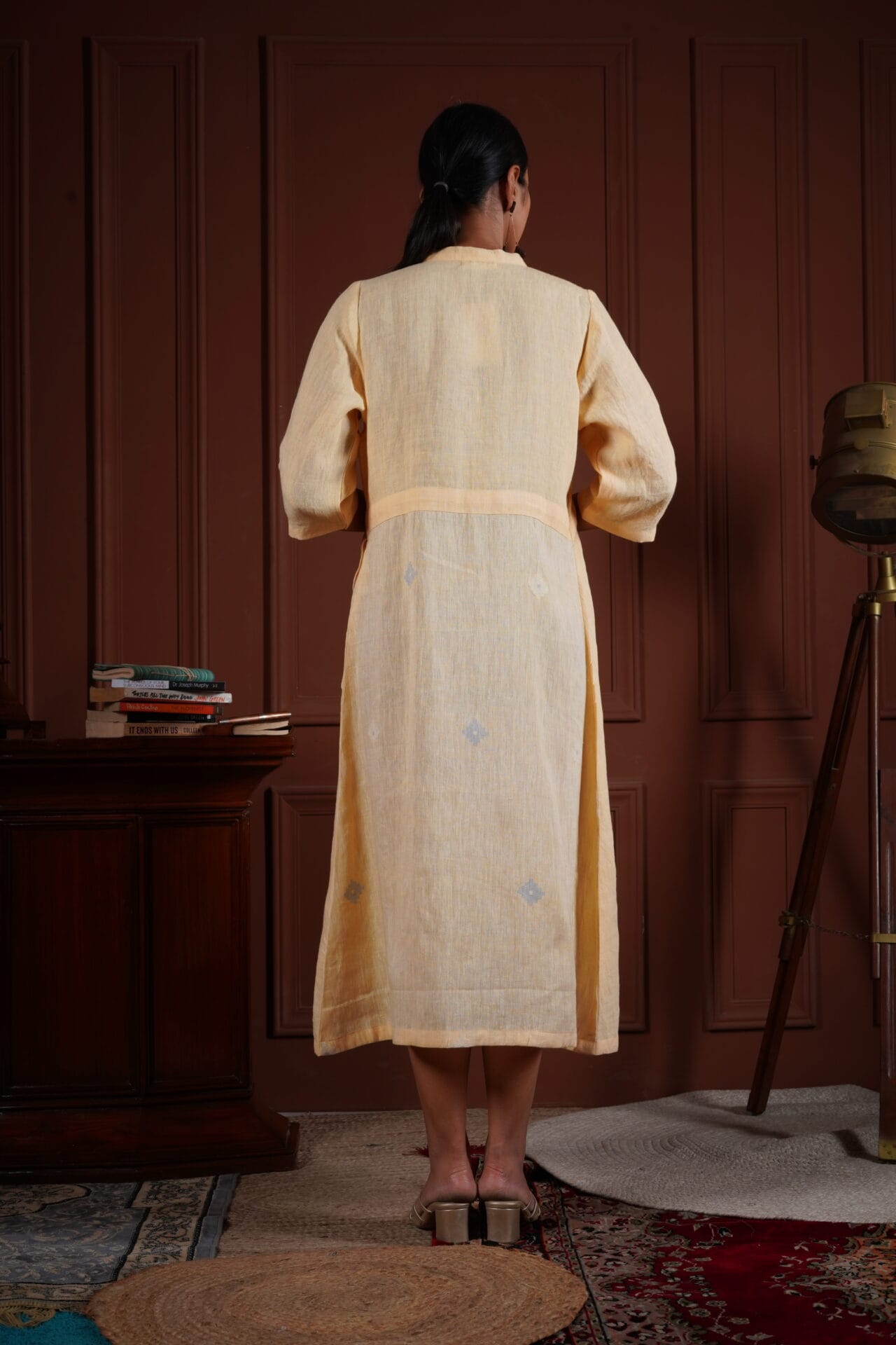 Light mustard cotton jamdani V neckline dress adorned with detailed geometric motifs in contrasting colors across the skirt. WASH INSTRUCTIONS – ONLY DRYCLEAN. Transparency & Certificate: Made in India with care, using natural dyes and produced in small batches with ISO certification. Shipping Courier charges DOMESTIC(IN INDIA) : ?500/KG, INTERNATIONAL : ?3000/KG