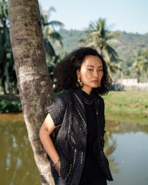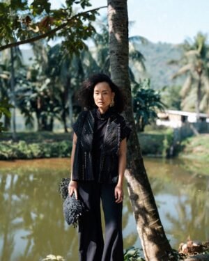 The garment is made from hand woven upcycled fabric and so the color might vary slightly for each batch.