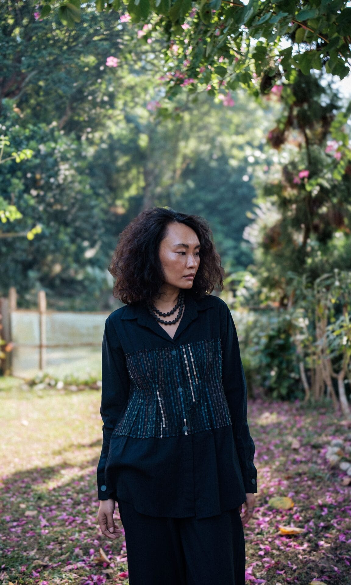 The garment is made from hand woven upcycled fabric and so the color might vary slightly for each batch.
