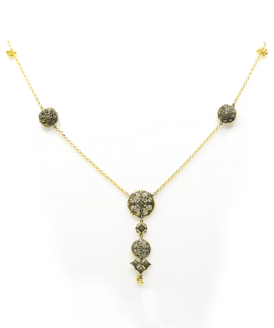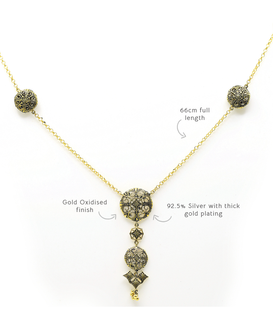 This hivda haar is a long necklace with delicate lattice motifs and charms. This necklace is handcrafted in 92.5% silver, with a gold oxidized finish. It has a S lock mechanism., Plating: Gold Plated with oxide finish, Metal Type: 92.5% Sterling Silver, Enamel / plating / gemstone: Gold oxidised, Lock Mechanism: Ring clasp lock, Measurement cm : Full Lenth – 66 cm, Measurement inches: Full Lenth – 25 inch, Care Instruction: Keep away from water, perfume and other liquids. Do not use any cleaning agents. Clean when storing in the provided pouches. Store them in moisture free areas and keep them away from water and liquid fragrances.