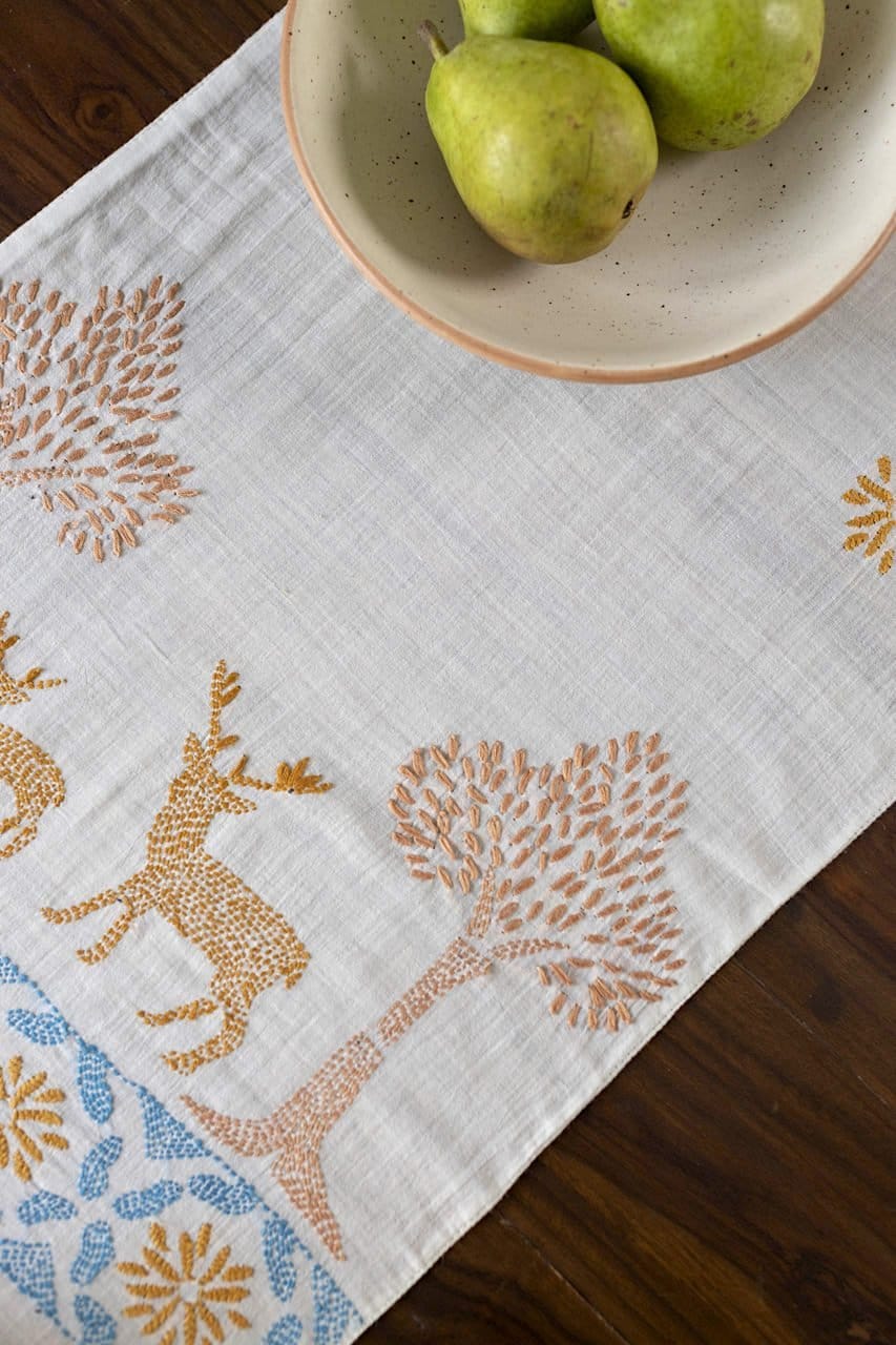 Inspired by the depth of the woods where wildlife has not yet been tarnished by urban humans, our handwoven ghicha cotton table runner is an ode to nature’s wonderful gifts. The Kantha hand embroidery is a gentle reminder from our artisans to respect and protect these gifts, much like its name, Hygge translating to enjoying the simple pleasures in life in Danish.