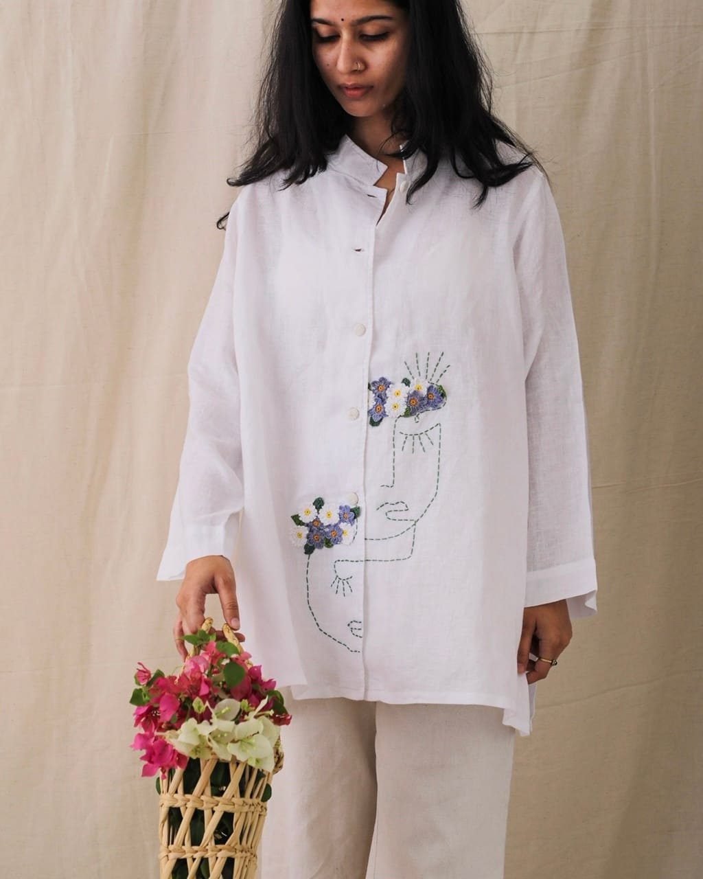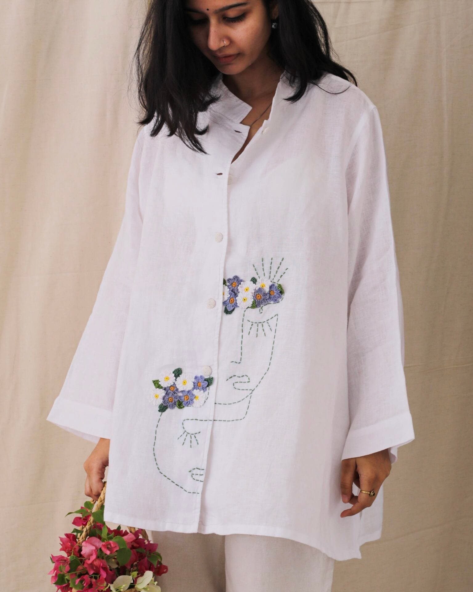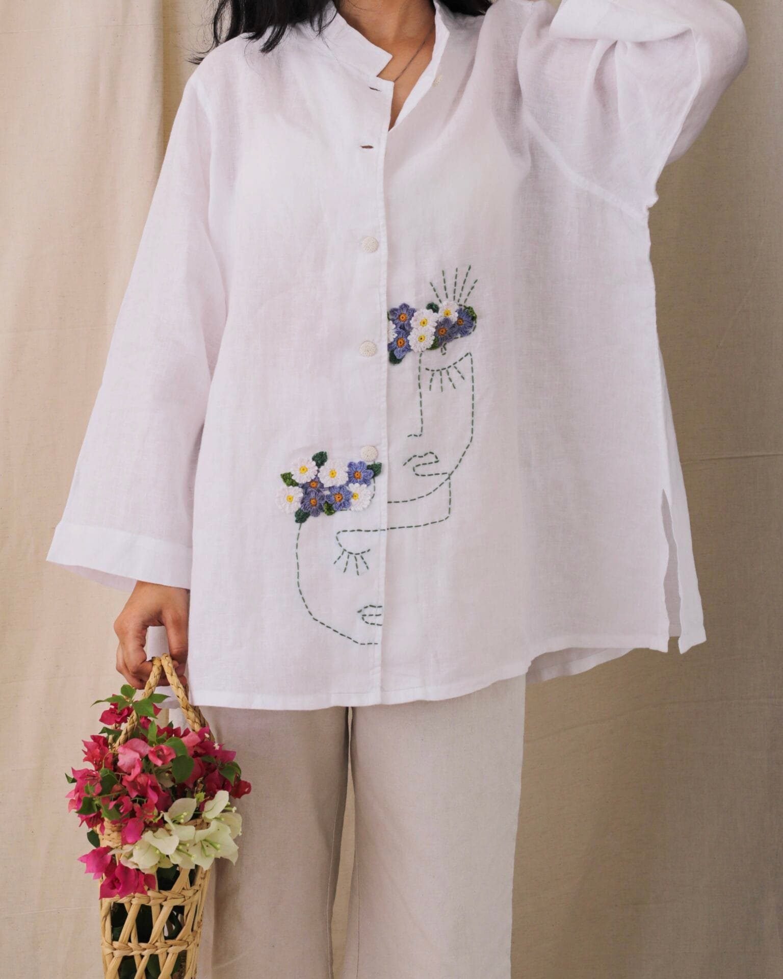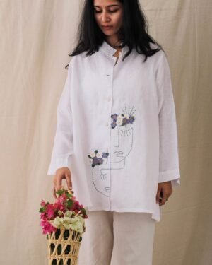 Crafted from premium, breathable linen for ultimate comfort. Features an artistic face line art with delicately embroidered floral accents, symbolizing natural elegance and charm. Relaxed Oversized fit with a mandarin collar, perfect for both casual and sophisticated looks