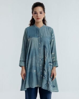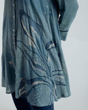 This exquisite shirt showcases fine embroidery along the sides and back, accentuating the fitted upper bodice and lending elegant volume to its shape. Delicate white and blue French knots and embroidered dots, all done by hand, create a subtle organic pattern that feels both understated and enchanting. The shirt features a front closure with shell buttons for a refined touch.Designed for a polished fit across the chest, the shirt offers a graceful, effortlessly elegant silhouette.Garment length: 34 inchesSleeves length: 20 inchesModel height: 5’7”, wearing size S