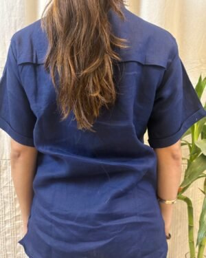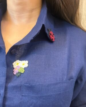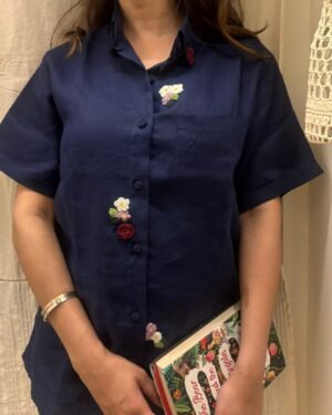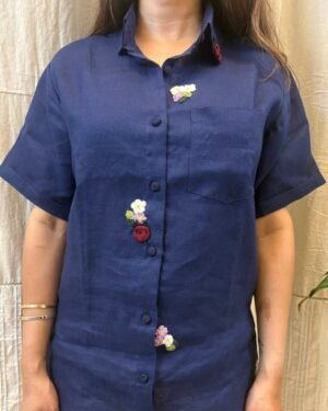 Women?s a breezy indigo shirt made with pure linen and scattered crochet flower details.