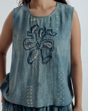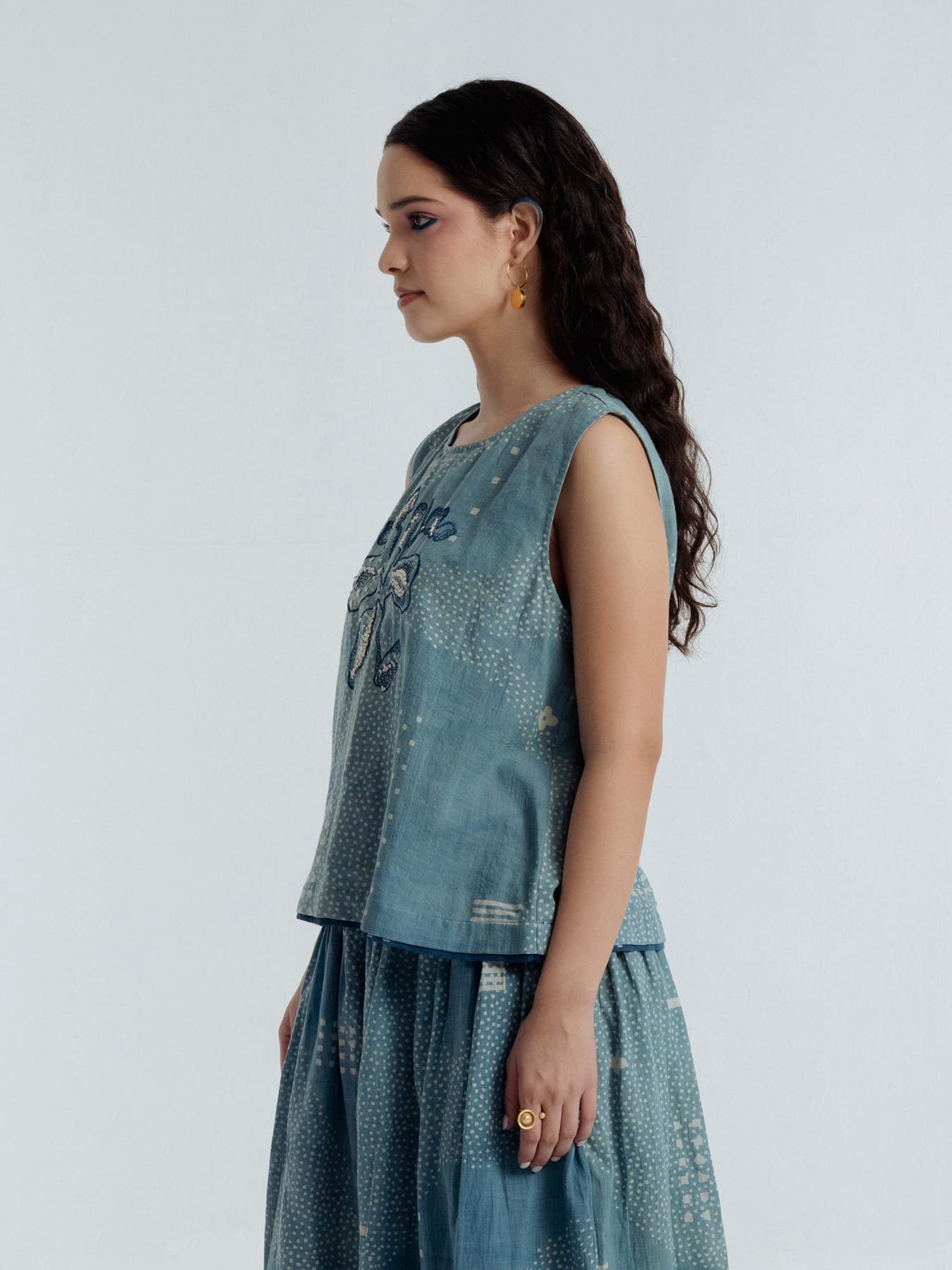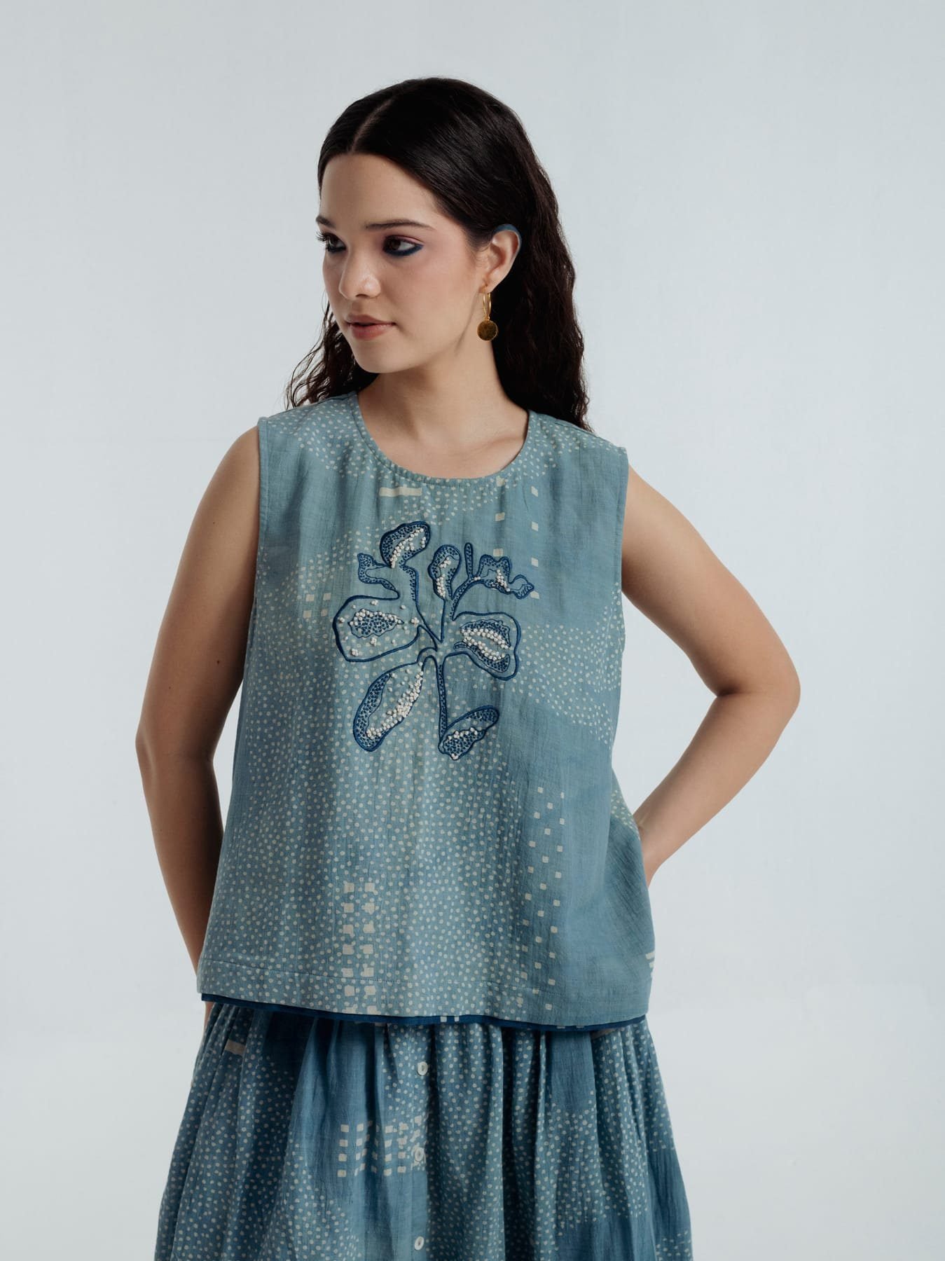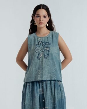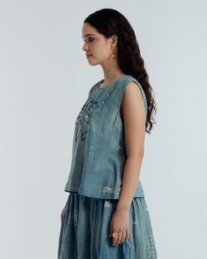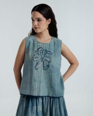 This exquisite top is adorned with Bagru’s traditional Dabbu mud-resist prints and intricate embroidery, a harmonious blend of craftsmanship and elegance. The relaxed silhouette drapes with effortless grace, flattering the figure ensuring all-day comfort. From brunch gatherings to garden walks and softly lit evenings, it moves with you through the day.Delicate blue and white hand-embroidered French knots form dots and lines in subtle, organic motifs, imparting a quiet poetic charm. Bold Dabbu patterns add depth and thoughtfully engineered placement, while a central embroidered motif draws the eye. A natural shell button provides a refined finishing touch.Versatile and timeless, Fayra transitions seamlessly through seasons and occasions, pairing beautifully with an array of outfits.Garment length: 21 inchesModel height: 5’7” (wearing size S)