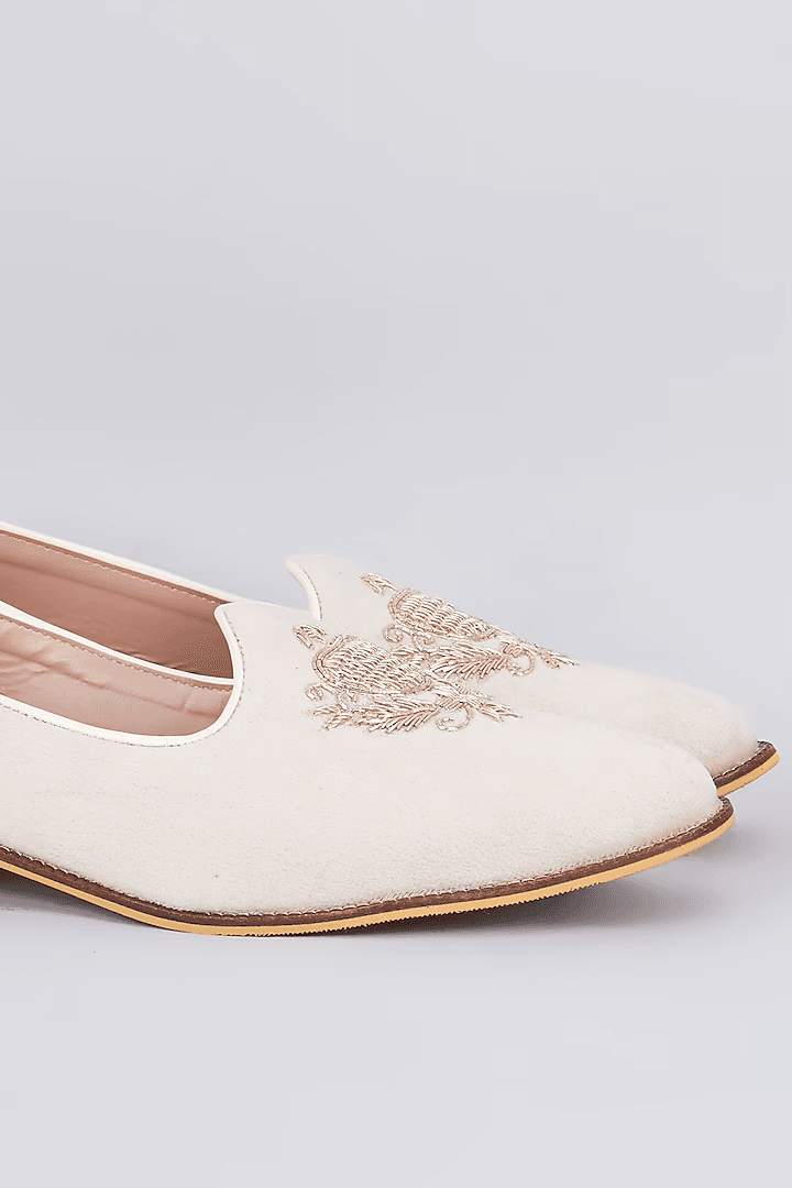 A pair of off white suede based slip on juttis enhanced with zari embroidered royal crest. It has a padded leather lining and a hard sheeted rubber sole.