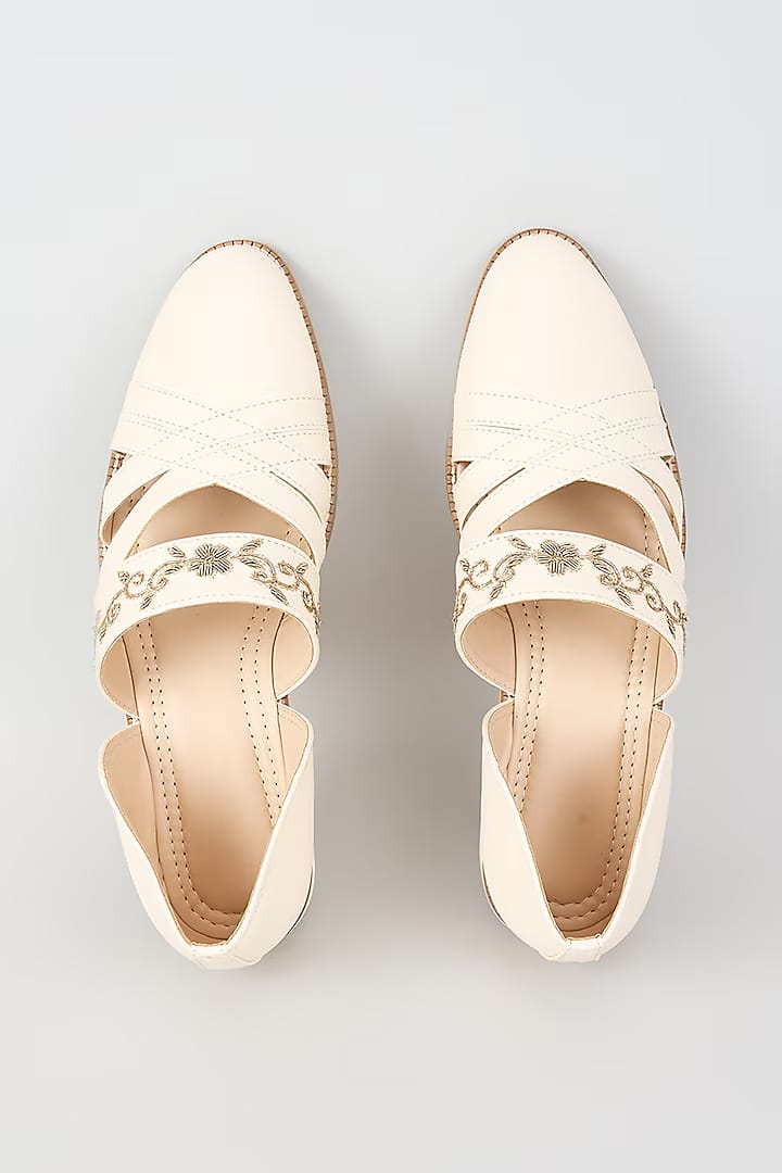 A pair of off white artificial leather based slip on sandals enhanced with zari embroidered border. It has a padded leather lining and a hard sheeted rubber sole.