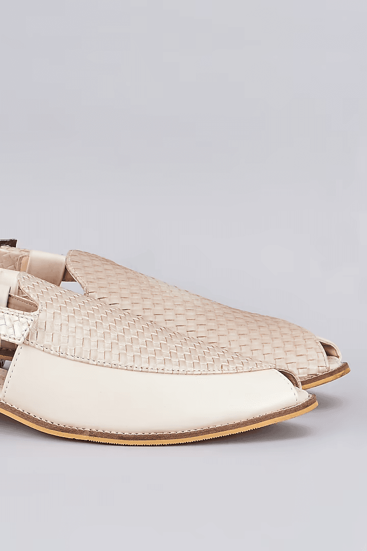 A pair of off white full grain leather based handcrafted slip on mules. It has a padded leather lining and a hard sheeted rubber sole.