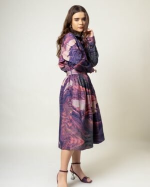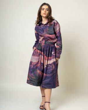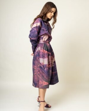 Printed gathered skirtFit: ComfortableFabric: Upcycled cotton (factory deadstock)Length: 28″Color: Purple