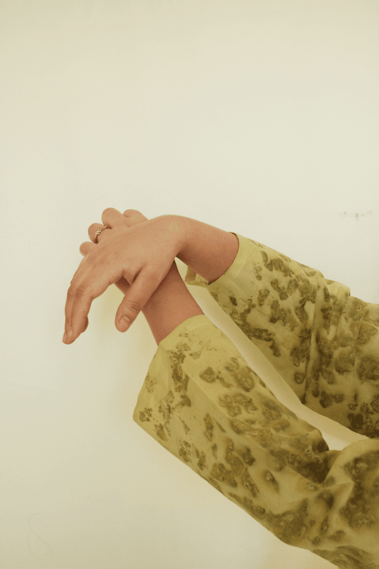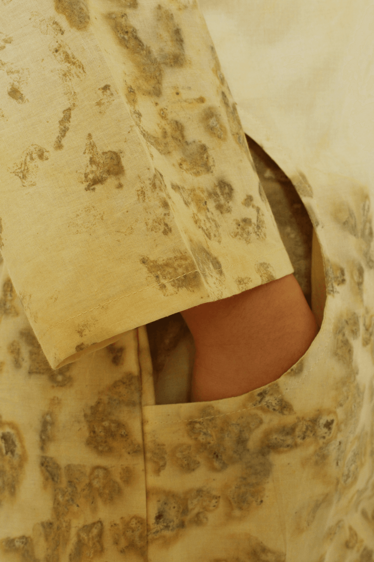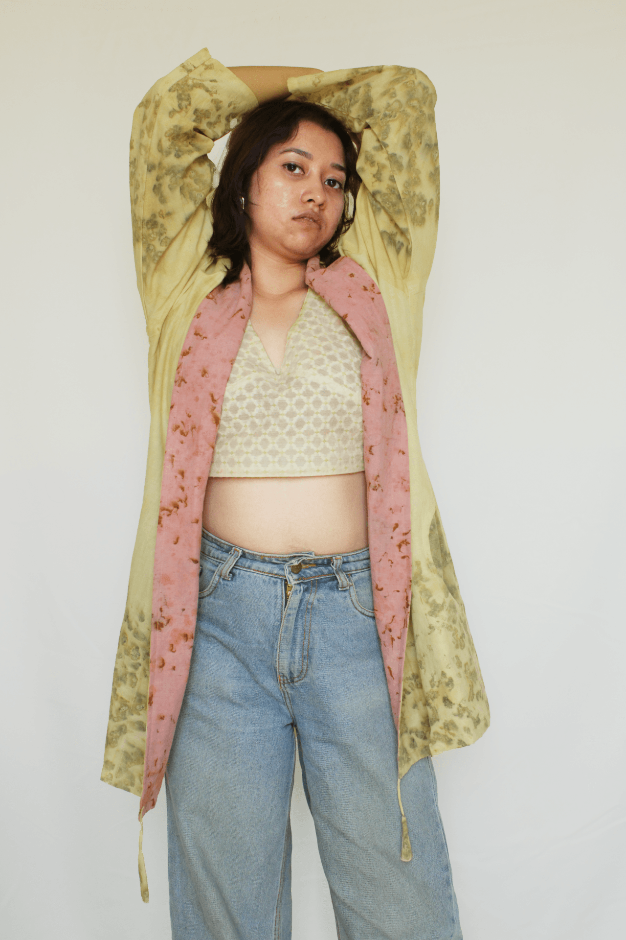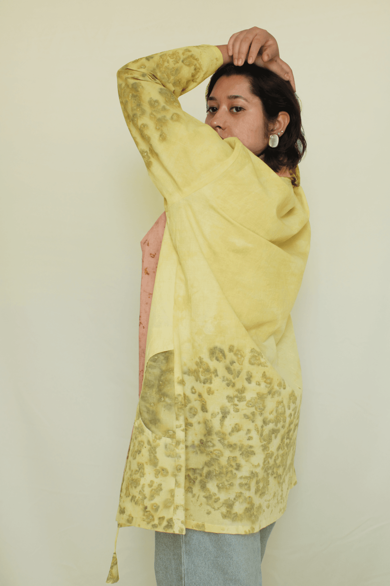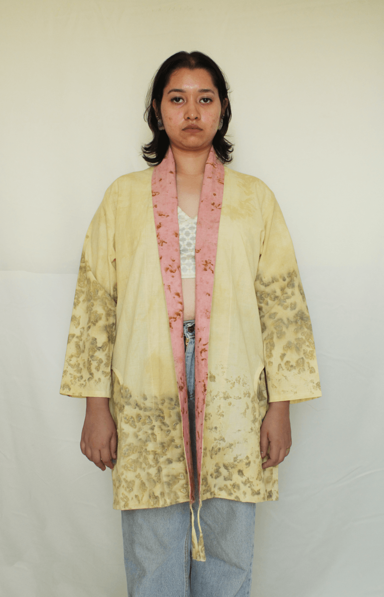 Bageeya’s “Karma Kaleidoscope” Jacket embraces eco-conscious style with this unique jacket. Crafted from sustainably sourced Organic Cambric cotton and dyed by hand with sacred temple flowers, this piece offers both comfort and a commitment to reducing environmental impact. Featuring a timeless shawl collar and intricate tessal details, it adds a touch of effortless elegance to any outfit. Our Karma Kaleidoscope jacket is a testament to sustainable practices. Made from luxurious Cambric cotton, known for its breathability and softness, it drapes beautifully on the body. The unique dye process utilizes Harda and Rose, natural pigments extracted from sacred temple flowers. This not only imbues the jacket with subtle color but also contributes to reducing environmental pollution caused by discarded temple offerings. Crafted with meticulous attention to detail, this jacket boasts a timeless design that transcends trends. The shawl collar adds a touch of sophistication, while the intricate tessal details at the bottom infuse the piece with a touch of personality. The zero-waste Katran construction ensures responsible use of materials, making this jacket a conscious choice for the style-conscious individual. This versatile jacket effortlessly transitions from casual to dressy. Pair it with jeans and a t-shirt for a relaxed weekend look, or elevate your ensemble with a flowy dress and heels for an evening out. The timeless design ensures it complements a variety of styles, making it a valuable addition to any wardrobe.