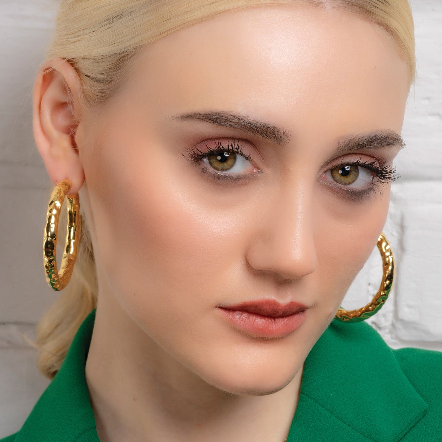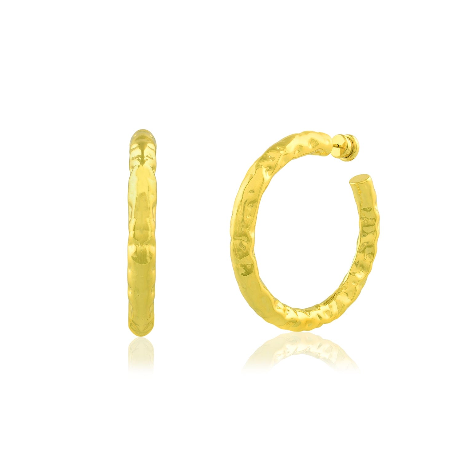 Each hoop showcases a distinct etched, raw-textured surface that enhances depth and visual interest while maintaining a clean, minimalist aesthetic. Crafted from a premium brass alloy and finished with 22KT real gold plating, these earrings deliver a rich gold look without compromising comfort or wearability.
