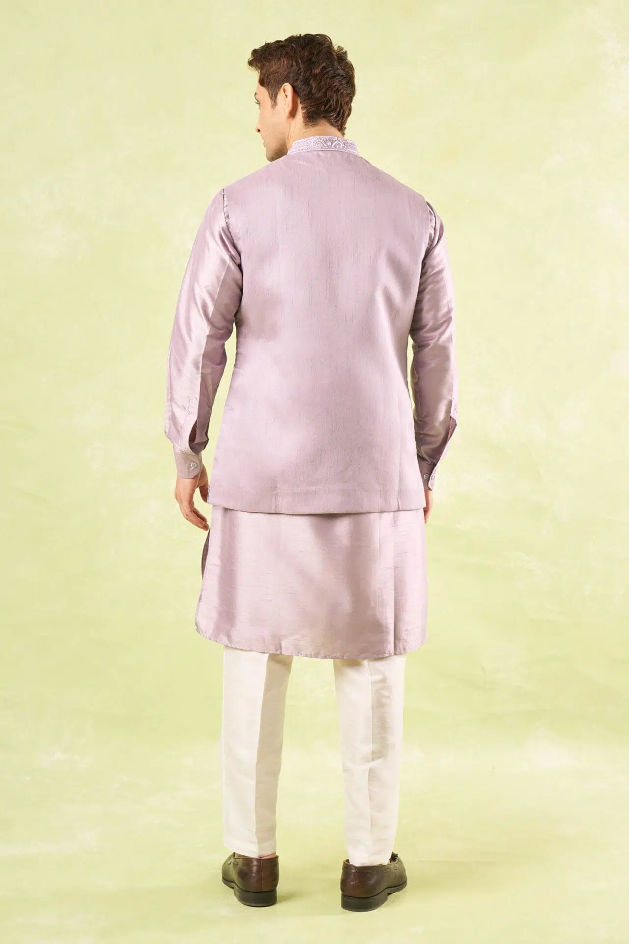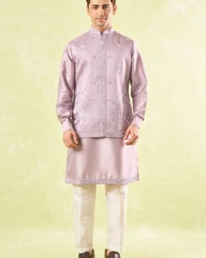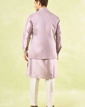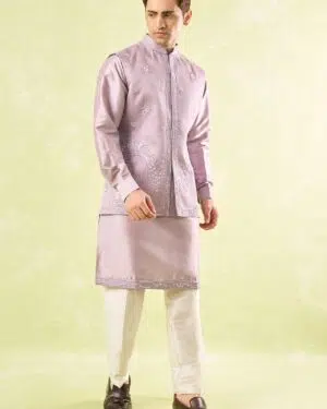 Lavender raw silk based jacket enhanced with pearl and cut dana embroidery paired with a matcing cotton silk based kurta and an off white dupion silk based mexican pants.