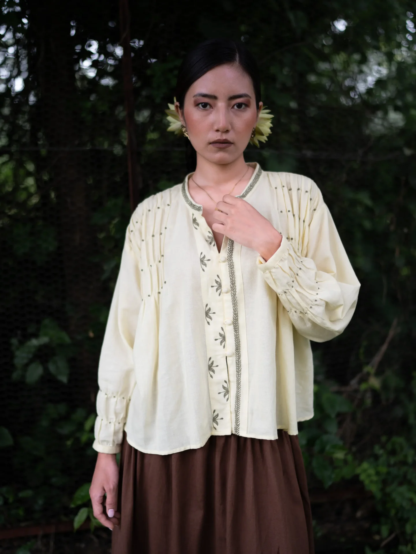 Breezy sophistication meets artisanal detail in this oversized, relaxed-fit top. Crafted from luxuriously soft linen in a warm butter yellow hue, it features a refined band collar and delicate hand-embroidered knot all over the sleeves and shoulders — a true celebration of craftsmanship. The front placket is adorned with delicate beautiful embroidery.