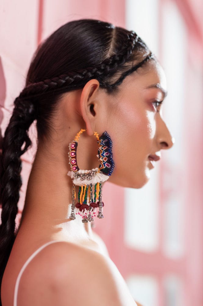 What makes these hoops truly exceptional is the combination of quirky tassels and metal hangings that add a playful, dynamic quality to the design. The vibrant tassels, hanging with a carefree movement, bring a touch of bohemian fun, while the metal elements provide a contrasting, stylish edge that elevates the overall look. The mix of textures, from soft tassels to sleek metal chains, creates an unexpected balance, adding layers of interest and sophistication.
