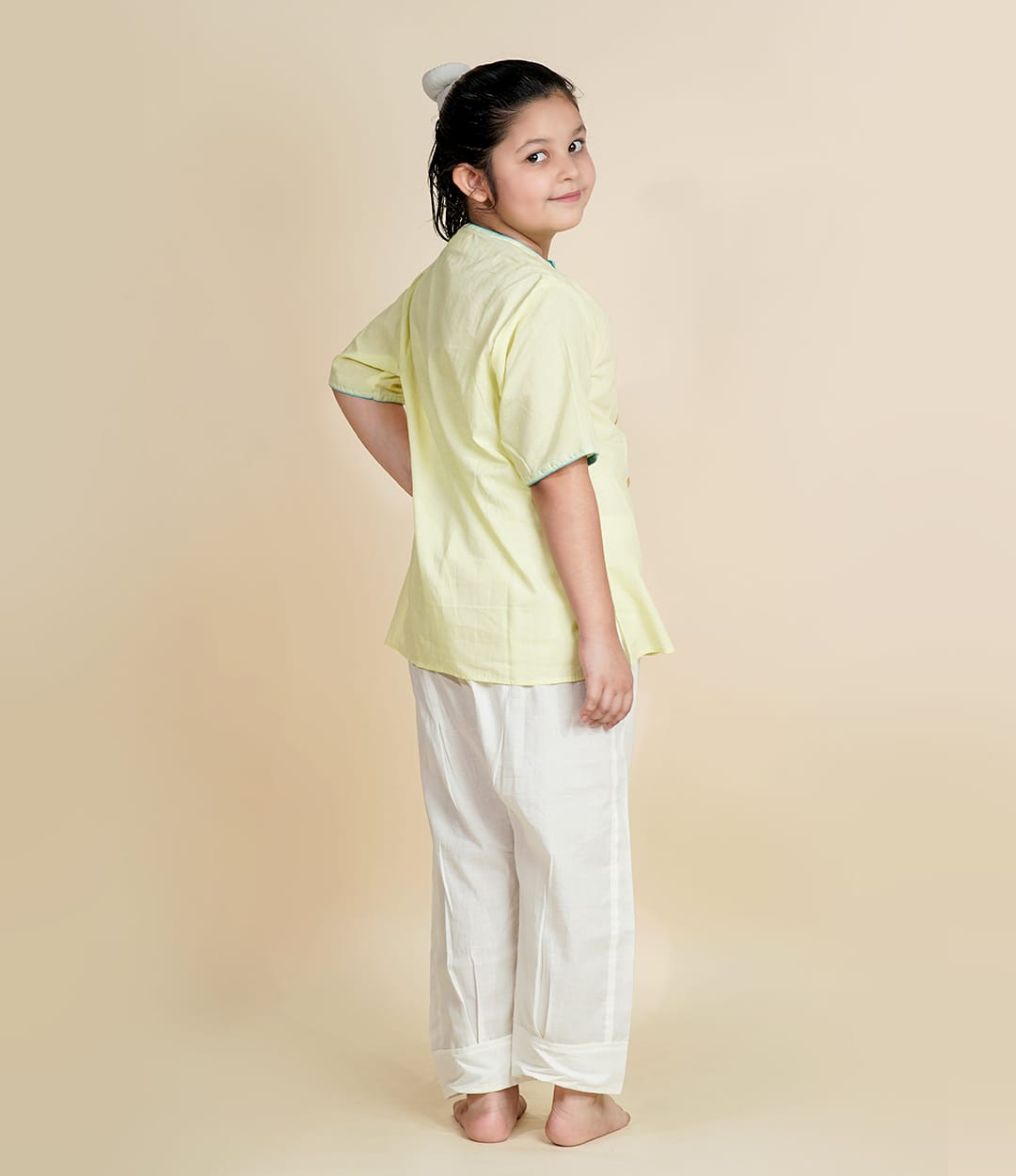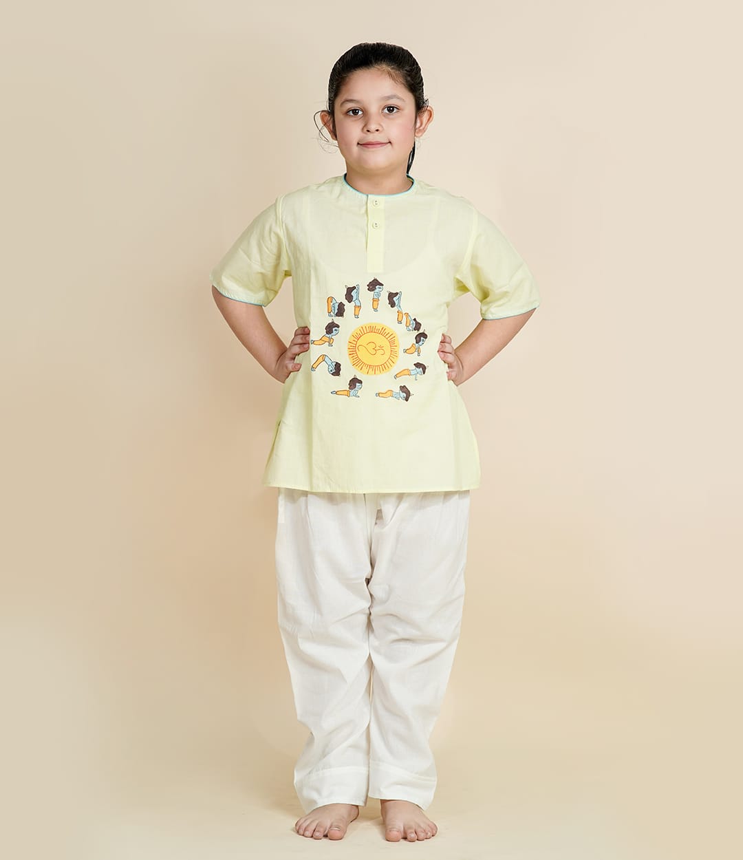 • Light pastel yellow kurta with Krishna Surya Namaskar artwork