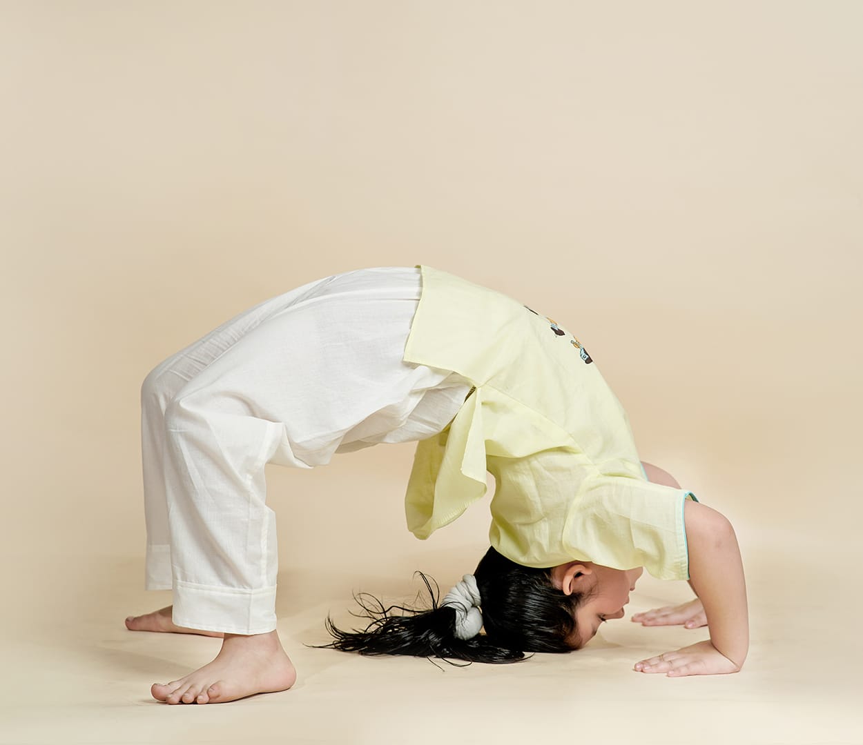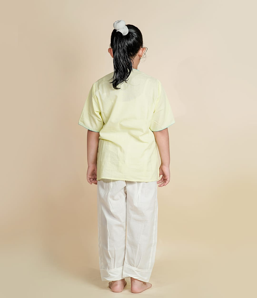 Celebrate mindful movement with our Little Krishna Surya Namaskar Yoga Set. The pista green top features a beautiful hand block print of Little Krishna performing Surya Namaskar, paired with easy-fit white cotton pants with a pocket. A perfect blend of comfort, culture, and calm for young yogis.