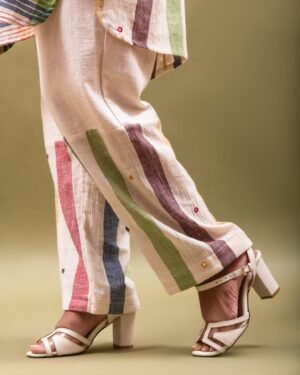 Elevated with subtle stripe detailing and artisanal mirror work designed for comfort versatility and everyday luxury. WASH INSTRUCTIONS - ONLY DRYCLEAN. Transparency & Certificate: Made in India with care, using natural dyes and produced in small batches with ISO certification. Shipping Courier charges DOMESTIC(IN INDIA) : ?500/KG, INTERNATIONAL : ?3000/KG