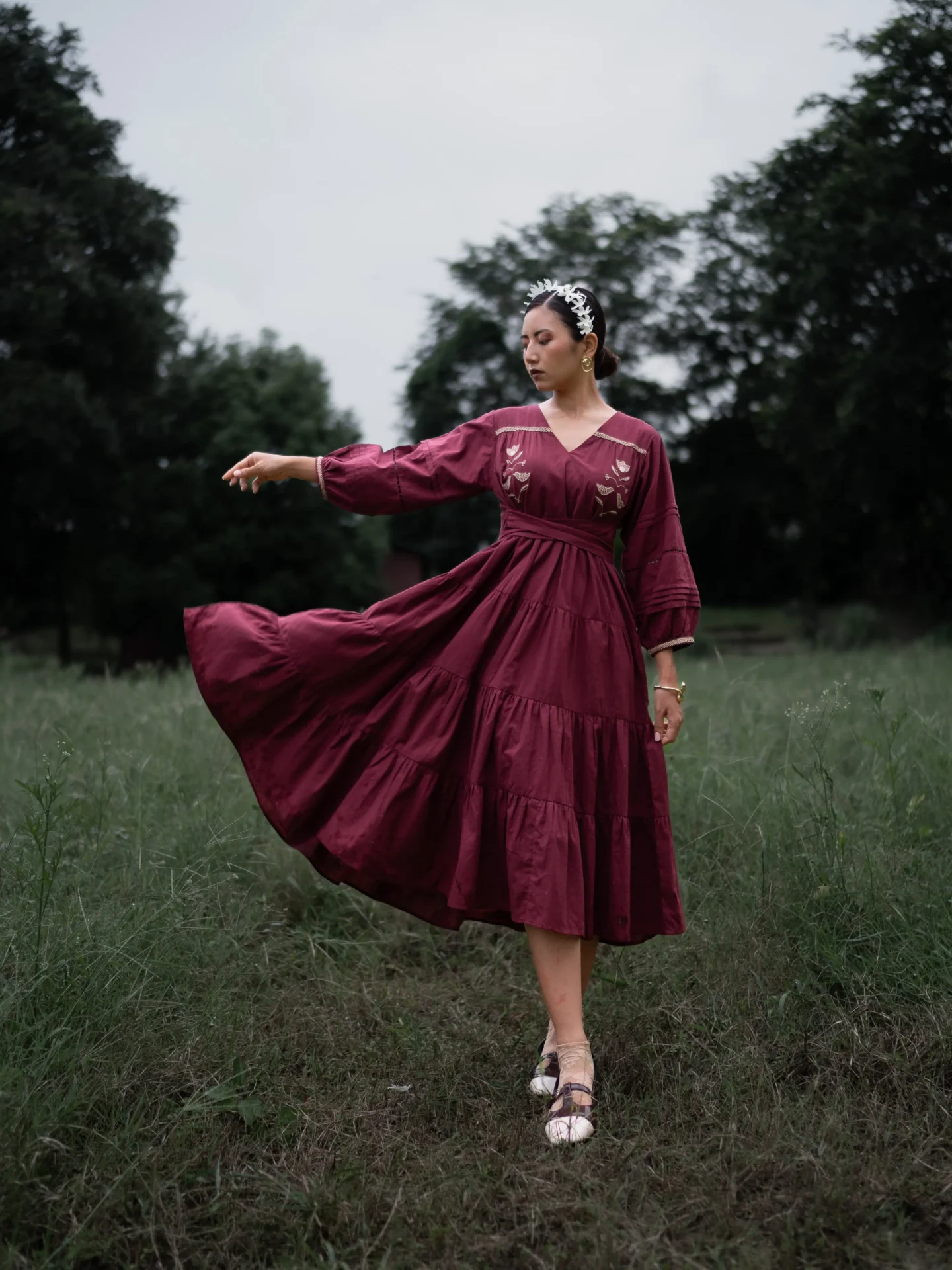 In rich maroon cotton, this dress showcases intricate hand embroidery at the front and lace-pleated detailing on the sleeves. Designed in a tiered silhouette with side belts for a perfect fit-and-flare style, it features a flattering V-neckline and practical pockets on both sides.