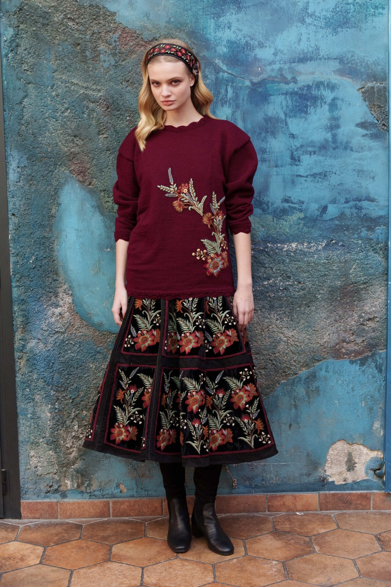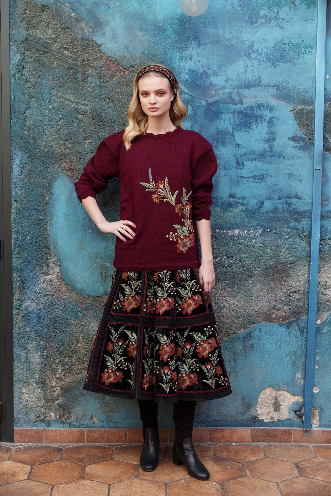 Maroon woolen knitted sweater with chintz embroidery