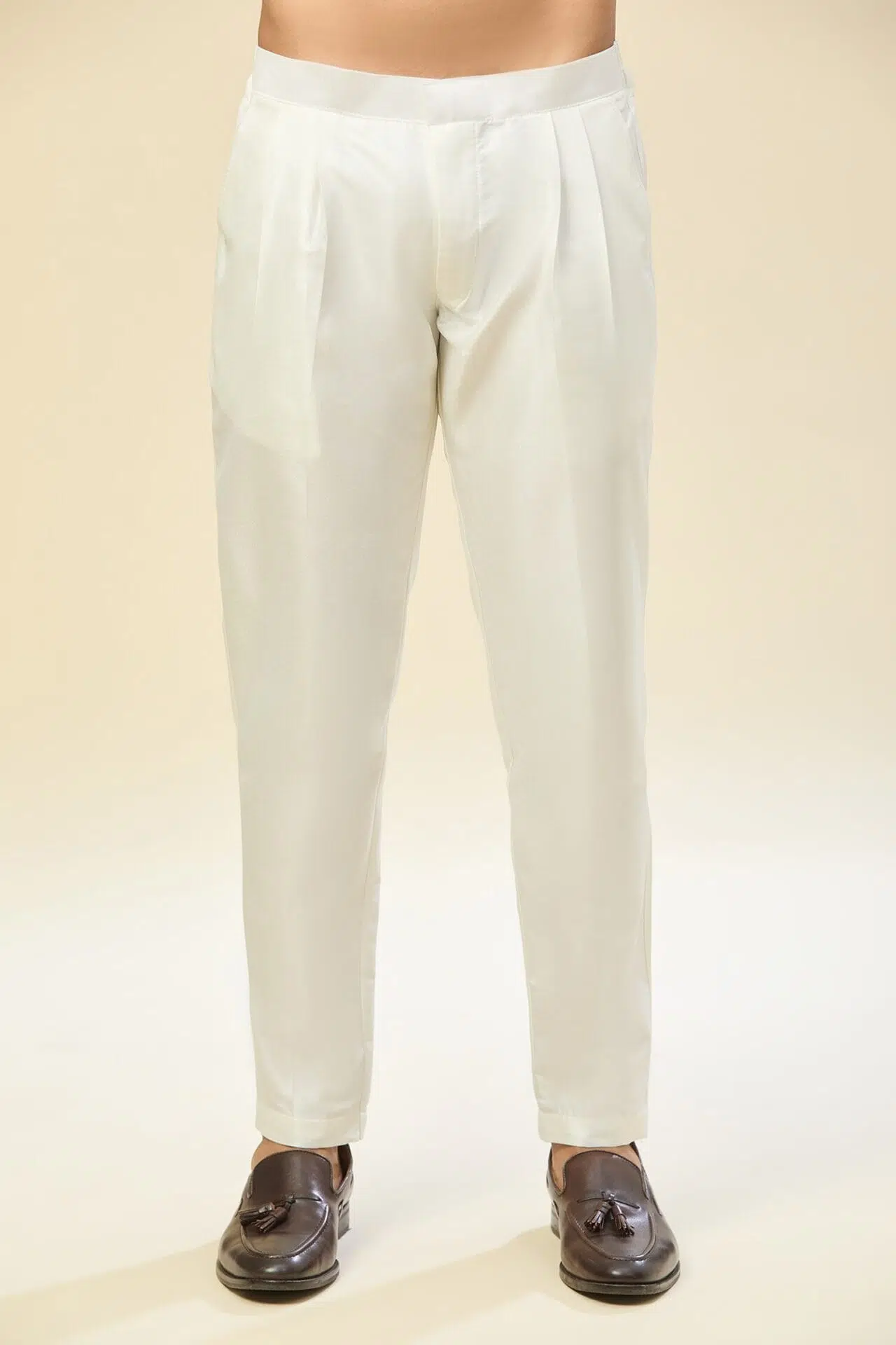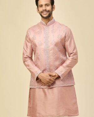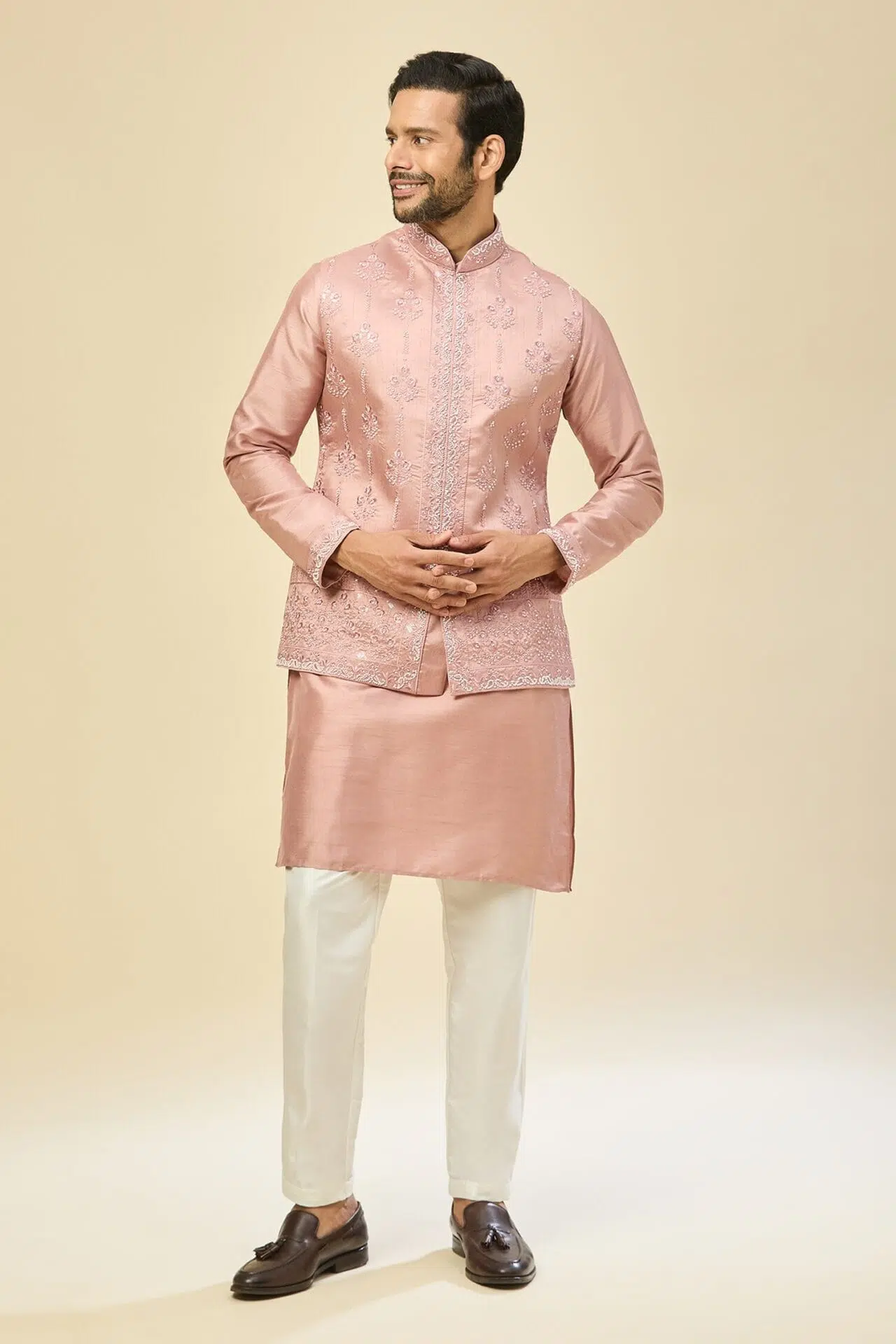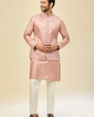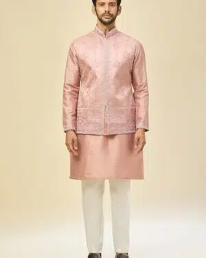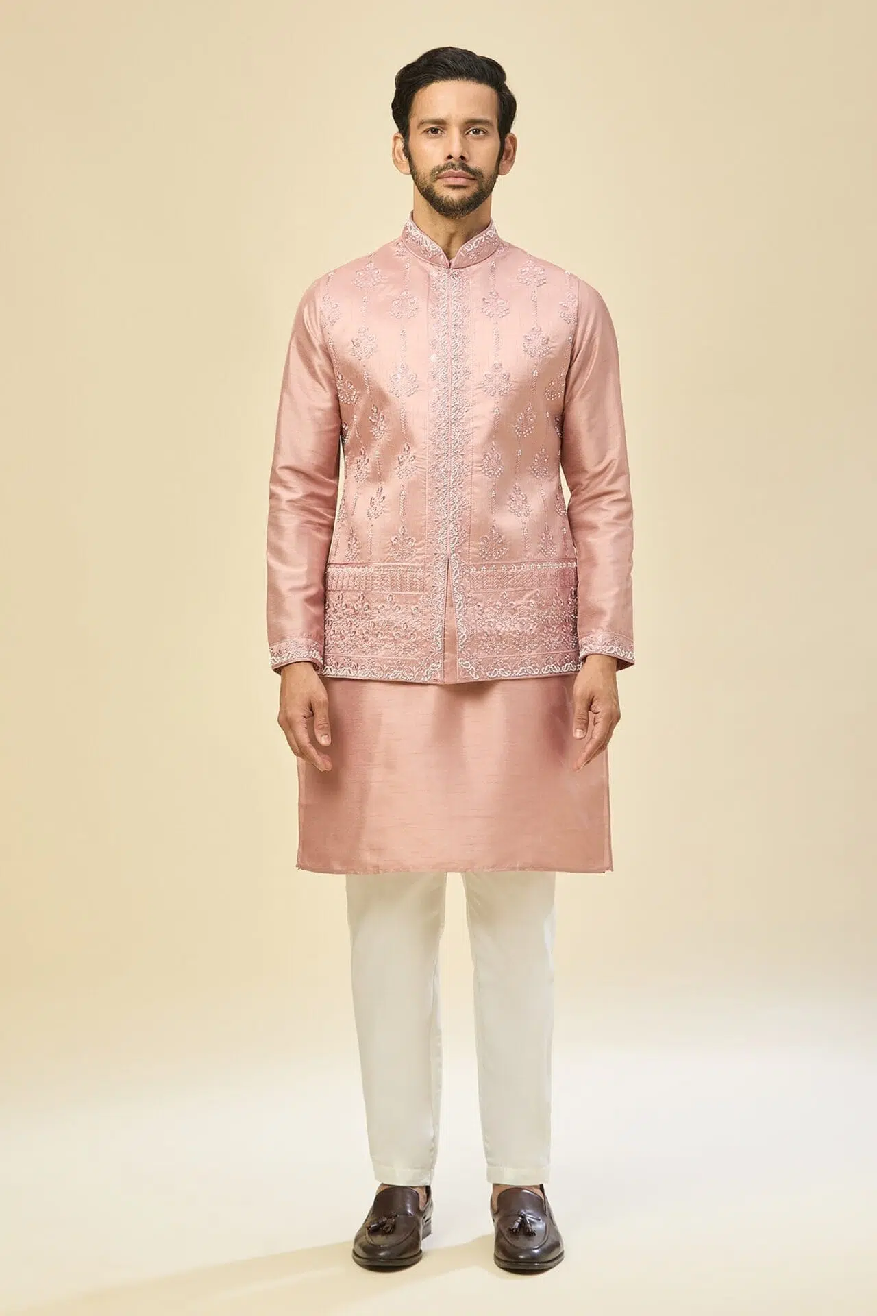 Mauve pink muslin silk based jacket enhanced with pearl and cut dana embroidery, paired with a matching muslin silk based kurta enhanced with pearl and cut dana embroidery on the hem and an off white dupion silk based pants.