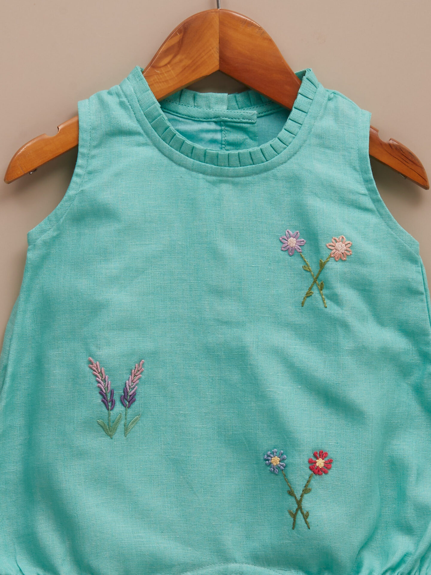 Charming hand-embroidered linen romper with a pleated neckline