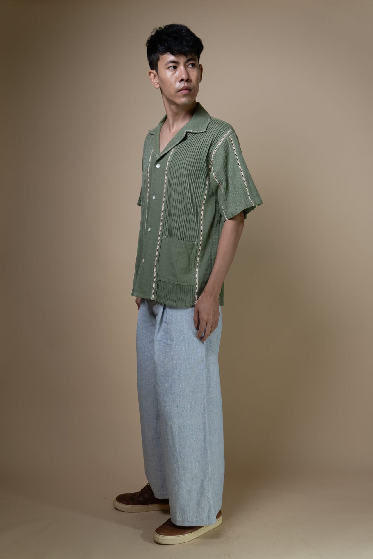 Designed in a relaxed-fit silhouette, it features a cuban collar lined with Kantha detailing. To enhance the shirt?s simplicity, pintucked panels are placed on the front, back, and sleeves, while ladder lace inlays provide an elevated touch. A single patch pocket on the front, accented with notch details, completes the design.