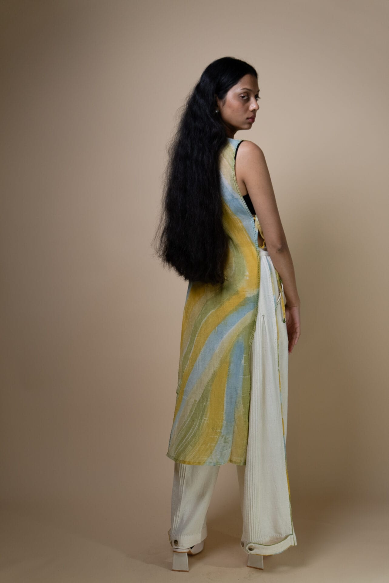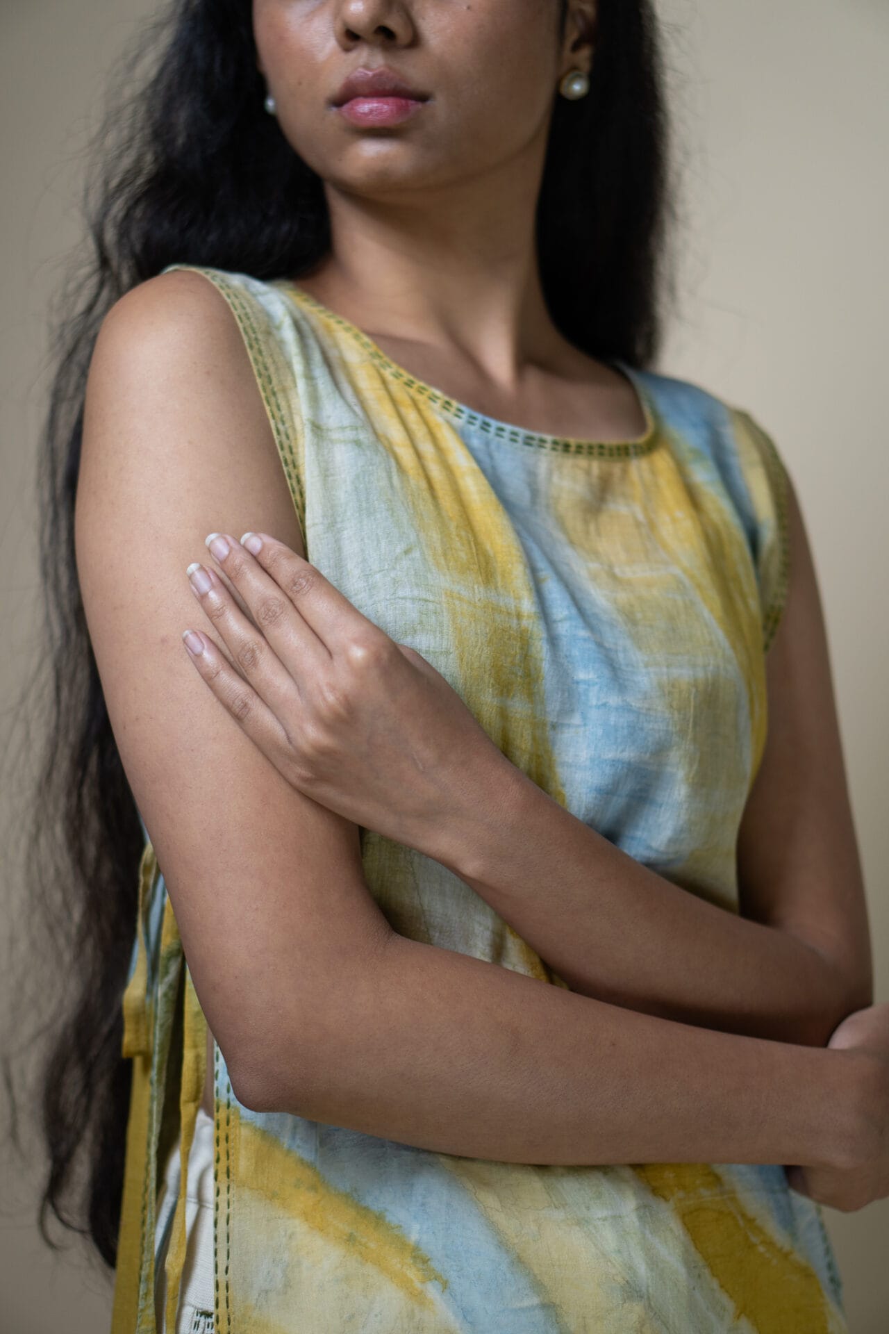 Crafted from 100% cotton fibers and natural materials, the Meadows Handpainted Bib is made from soft Mulmul, hand-painted using natural dyes from indigo, iron; and marigolds collected from temples and repurposed into dyes. The abstract, intuitive brush strokes are the highlight of this design, adding an artistic flair to the piece.