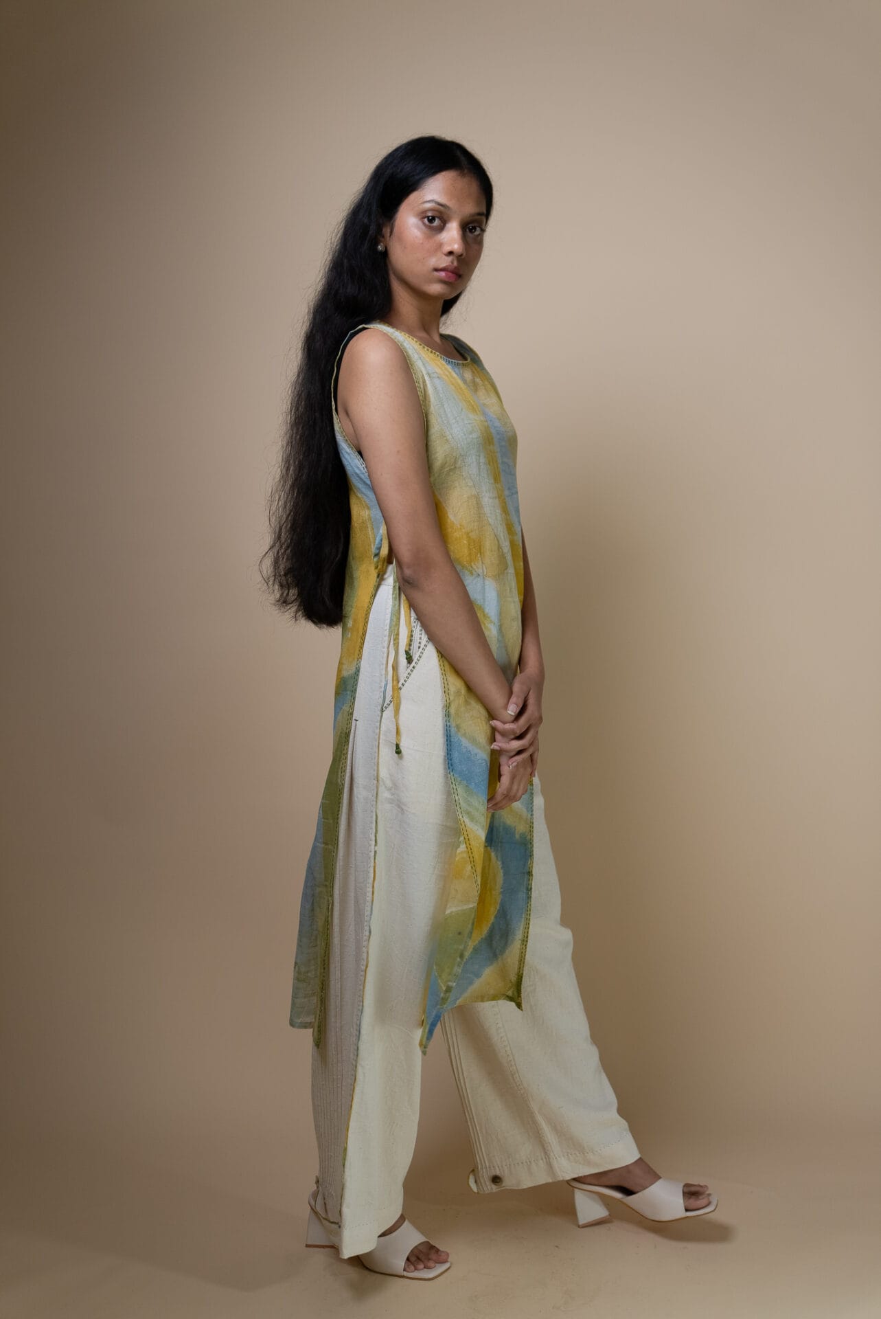 This reversible long bib is accented with Kantha embroidery along the neckline. Open at the sides and secured by drawstrings, it offers a flattering, free-size fit. Perfect for layering or wearing on its own, this piece is adaptable to any style.